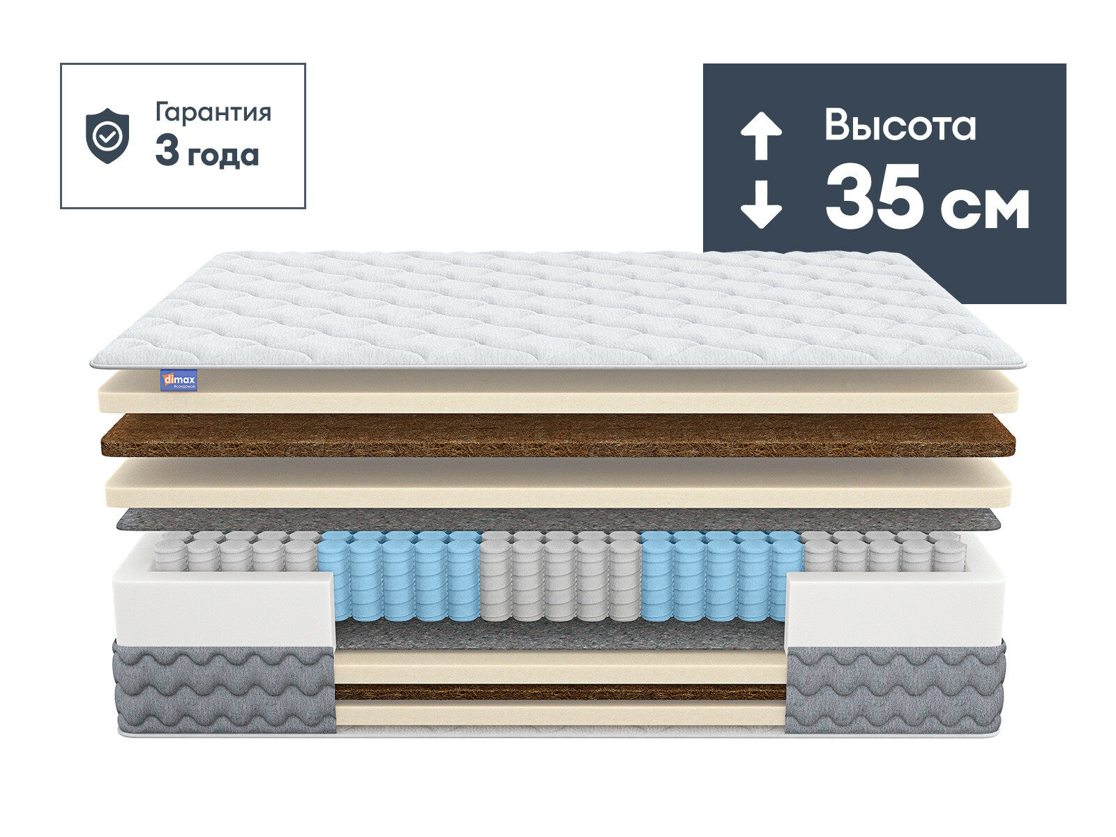 Димакс Биг Дабл Хард — матрас с многоуровневой системой жесткости, созданный для тех, кто ищет идеальный баланс между ортопедической поддержкой и комфортом. Высокая конструкция объединяет ортопедические наполнители и зональные пружины, обеспечивая анатомически правильное положение тела даже при нагрузке до 130 кг на спальное место.
