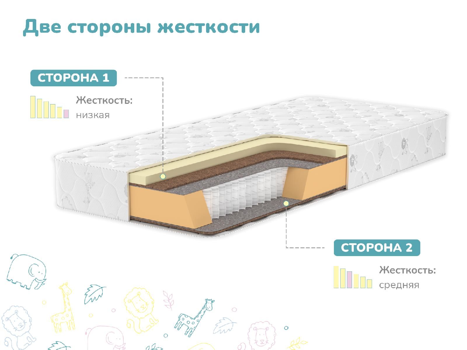 В середину матраса заключён независимый пружинный блок с частотностью 1000 пружин на спальное место. Именно он даёт правильную точечную поддержку для спины и тела ребёнка. Каждый элемент независимо включается в работу при поступлении на него давления. Такое функционирование обеспечивает филигранную подстройку поверхностей матраса.