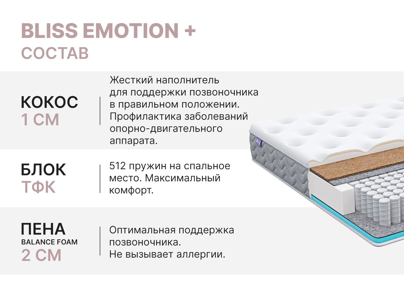 Димакс Bliss Emotion+ — это матрас с двумя уровнями жёсткости, который позволяет легко варьировать характеристики спального места. Универсальная классическая средняя жёсткость делает модель идеальной для людей с разным телосложением. Фирменный пышный чехол превращает постель в нежное облако, обеспечивая комфорт и безмятежность во время сна.