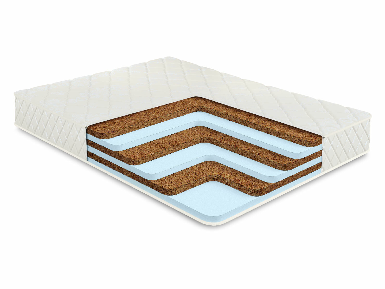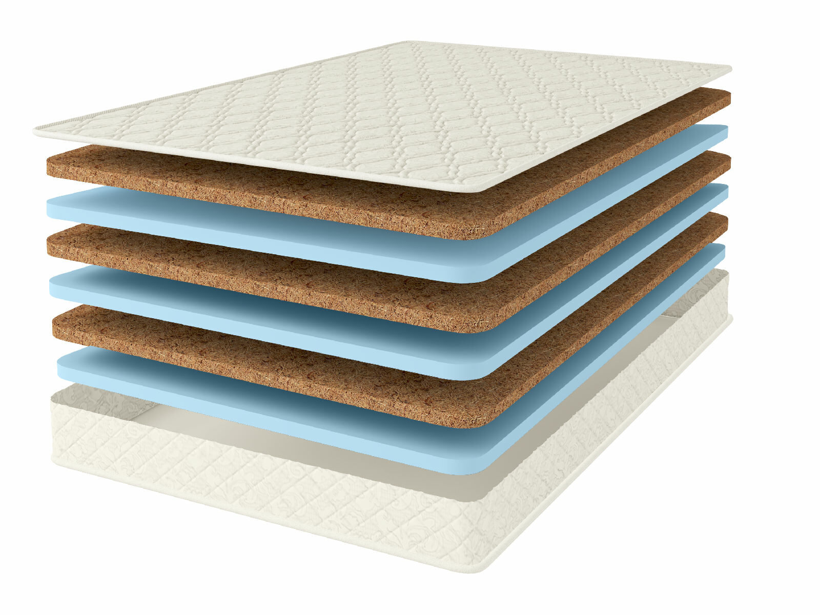 Изделие построено по типу сэндвича и состоит из чередующихся слоёв кокосовой койры и пены Ecofoam. Так с одной стороны оказывается один вид наполнителя, а с другой – второй. Это и обеспечивает различную степень жёсткости поверхностей – высокую и чуть больше среднего уровней. Матрас необходимо переворачивать в зависимости от собственных предпочтений, а также времени года.