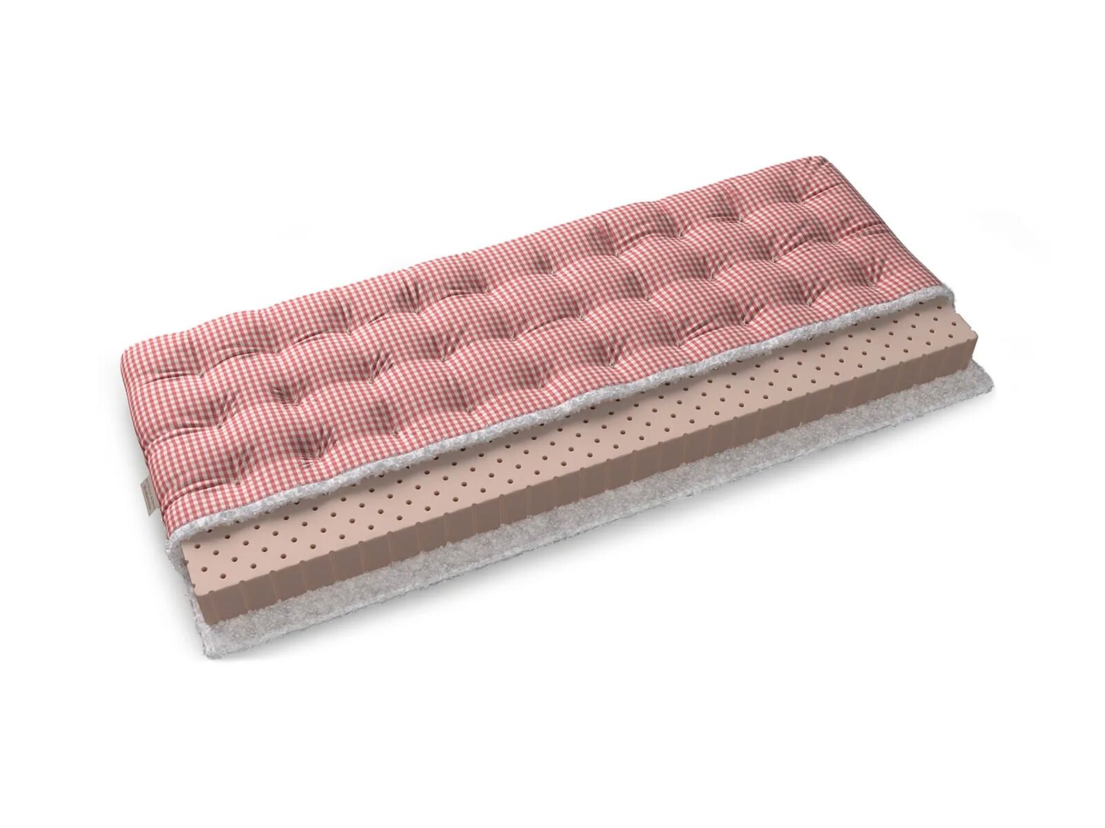 Самый популярный настил. Рулонный латекс отличный и долговечный, хорошо распределяет нагрузку, имеет ортопедический эффект. За счёт упругости латекса давление на сосуды и мышцы во время сна оказывается минимальным. Латекс – уникальный материал с точки зрения индустрии сна. Он прекрасно используется в качестве самостоятельной основы.