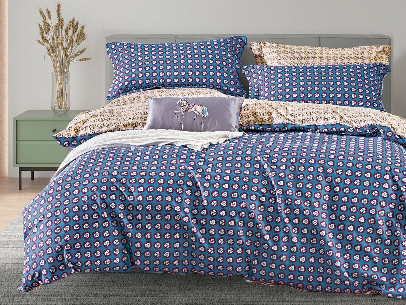 Строгий дизайн Dofin порадует представителей сильного пола. Он так же органично впишется в семейную спальню, привнося в нее энергию простых форм в благородных сине-бежевых тонах. В состав постельного белья входит 100% хлопок, который отлично пропускает воздух, хорошо впитывает влагу, обладает высокой износостойкостью и прекрасно подходит для людей с чувствительной кожей. За счет сатинового переплетения нитей ткань обладает нежными переливами, красота которых сравнима с шелковым блеском.