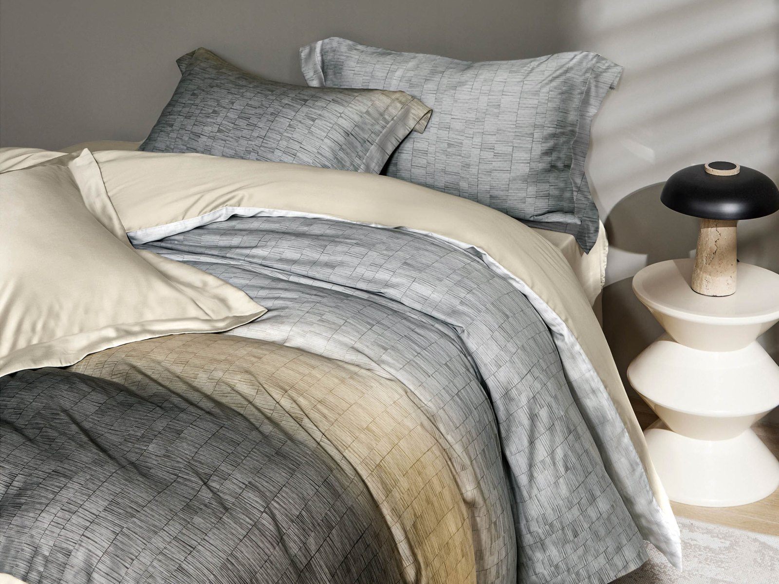 Графичный дизайн Sentido с оригинальным градиентом модных оттенков серо-бежевого будет уместен как в мужской, так и в семейной спальне.