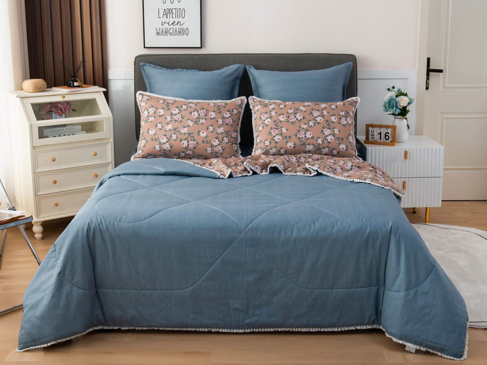 В комплекты комфортеров с одеялом Бернадетт входят наволочки, простыня и легкое всесезонное одеяло. Оцените это современное и очень удобное решение, которое идеально подходит тем, кто не любит возиться с пододеяльниками.