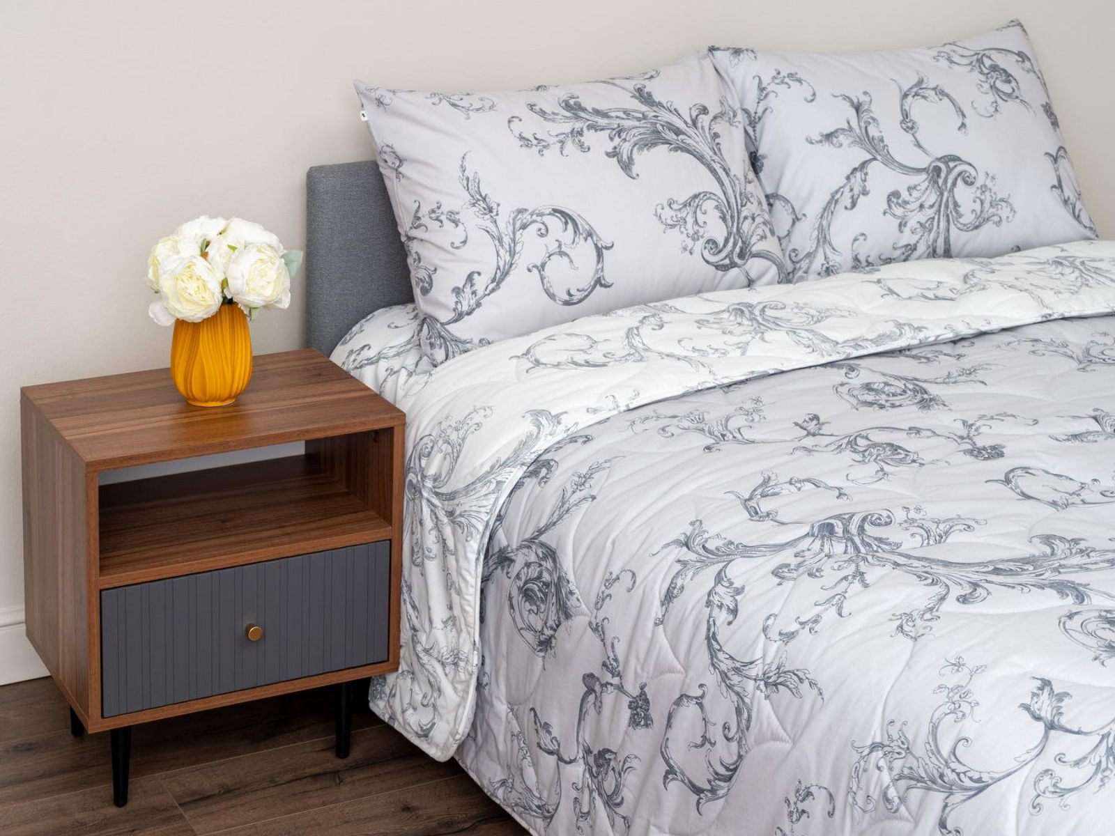 Комплект Мелвин легко стирается в обычной машине в бережном режиме и также легко гладится.