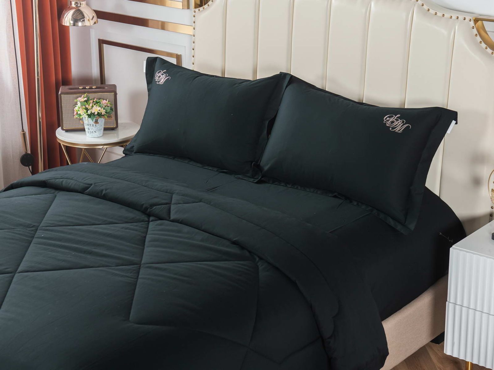 В комплект входят простыня, наволочки и одеяло. Одеяло простеганное, легкое и воздушное, его можно стирать в стиральной машине. Благодаря микроволокну в составе наполнителя для одеяла, оно всегда принимает свою начальную форму.