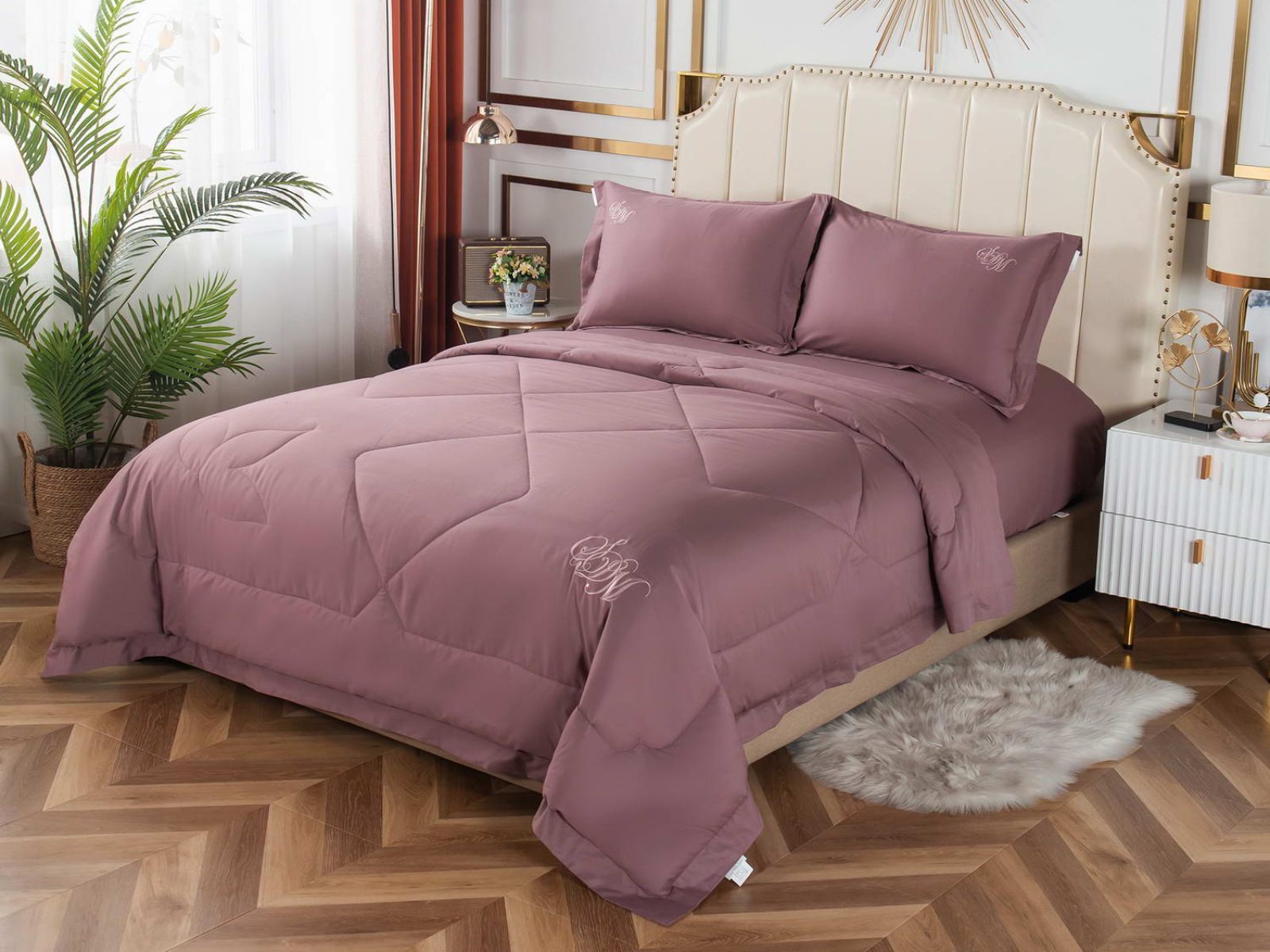 В комплект входят простыня, наволочки и одеяло. Одеяло простеганное, легкое и воздушное, его можно стирать в стиральной машине. Благодаря микроволокну в составе наполнителя для одеяла, оно всегда принимает свою начальную форму.