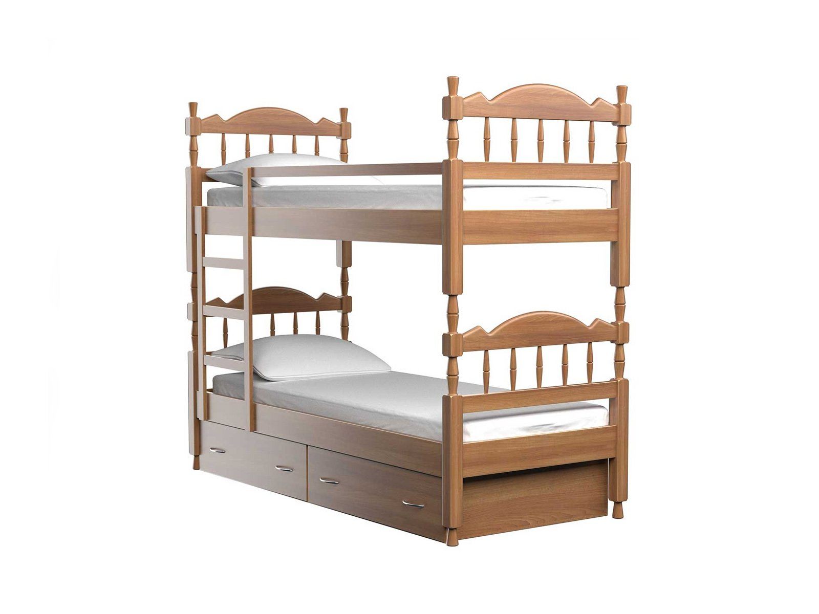 Удобная двухъярусная детская кровать с ящиками для хранения постельных принадлежностей и надежно закрепленной лестницей. Для обеспечения безопасности ребенка второй ярус оснащен бортиком-ограничителем, исключающим падение ребенка во время сна. Деревянная кровать из массива ясеня выполнена по индивидуальной технологии. Детская кровать подарит больше пространства и идеально впишется в интерьер детской комнаты. Вместительные встроенные ящики прекрасно позаботятся об игрушках и постельных принадлежностях. Кровать полностью выполнена из натурального дерева. Кровати из массива ценных пород дерева – гарантия экологической чистоты в Вашем доме.