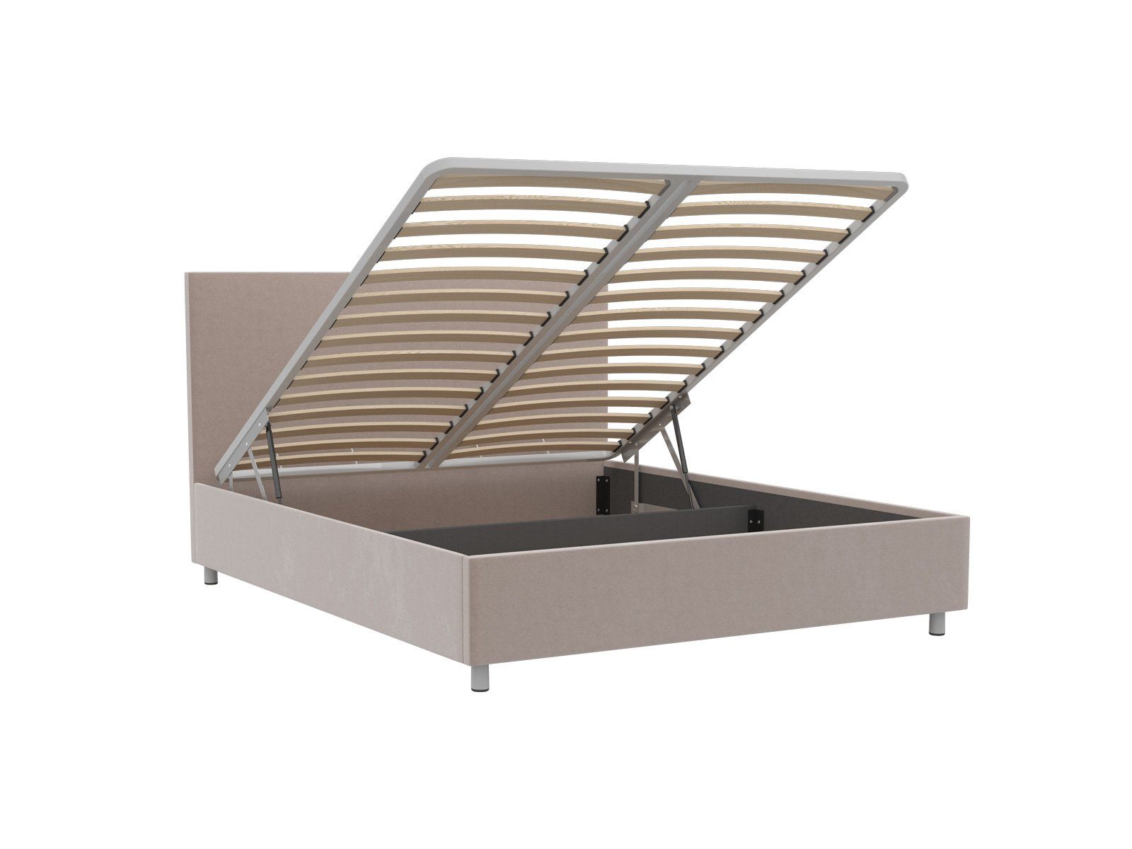 Кровать оснащена подъемным основанием с ламелями, под которым находится вместительный ящик для хранения. Рекомендуемая высота матраса от 13 см, вес матраса до 50 кг.
