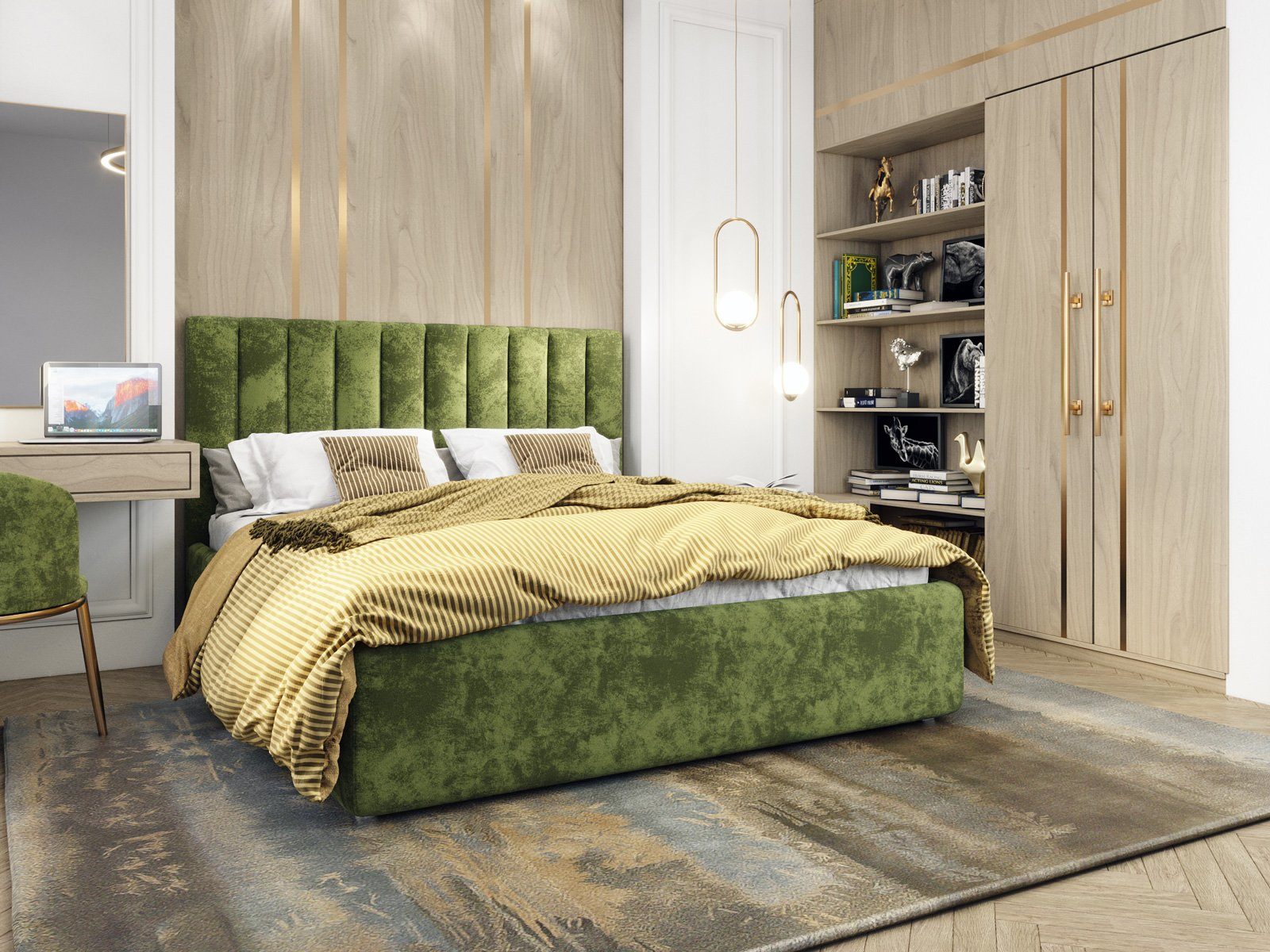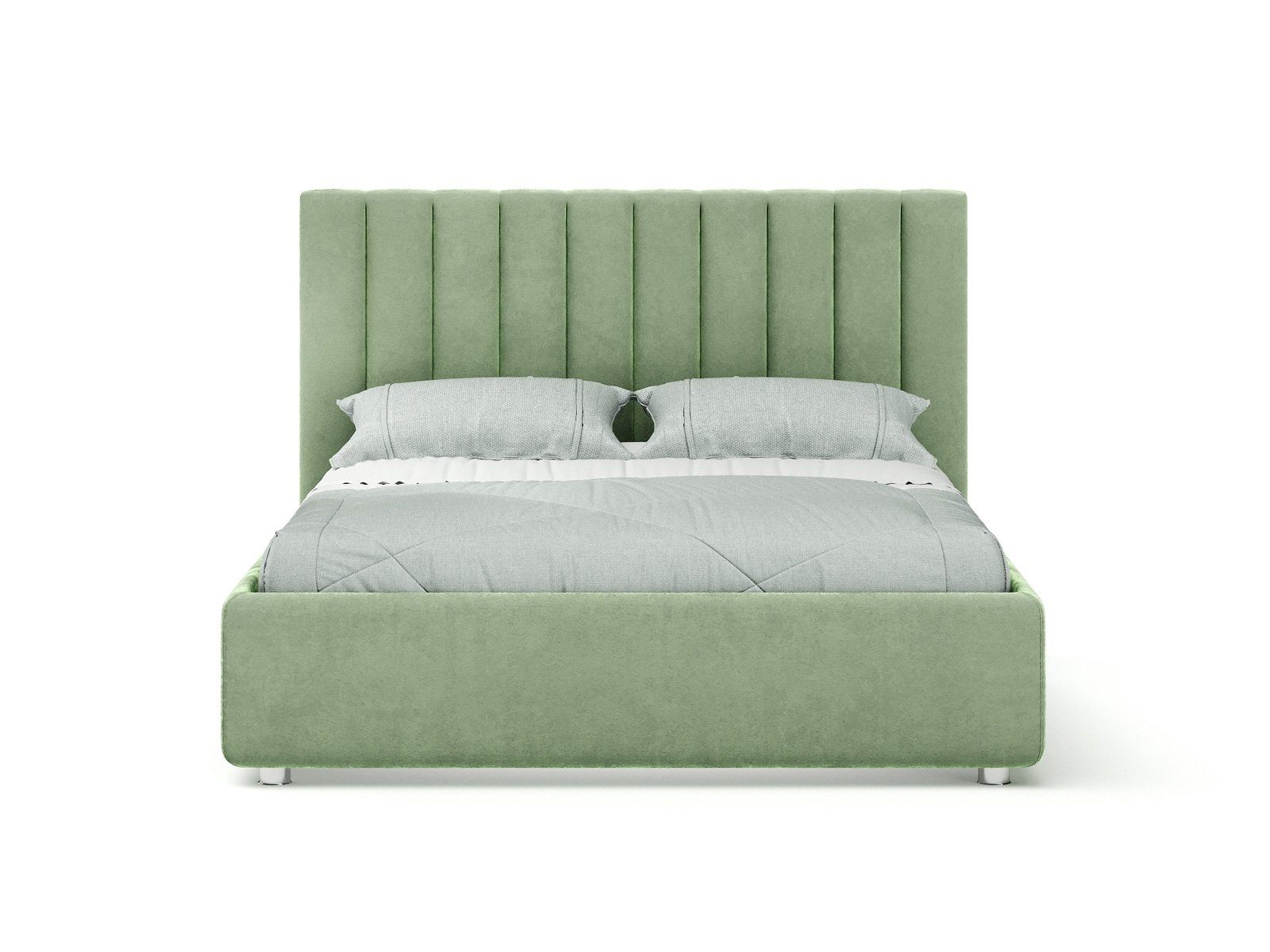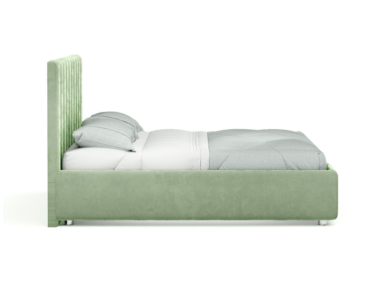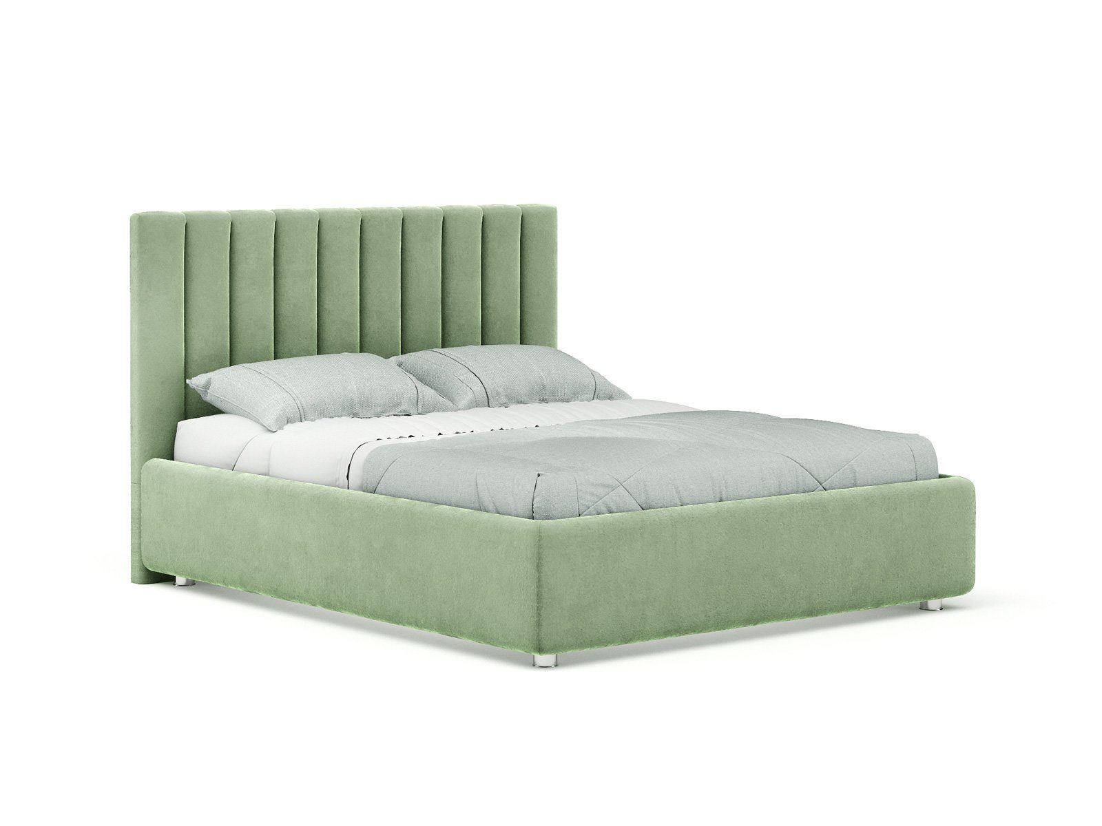 Кровать с мягким изголовьем, выполненным в виде 10 вертикальных панелей (вертикальная утяжка, всегда 10 шт независимо от размера спального места, с увеличением размера спального места увеличивается ширина панели), отличный вариант для спален с низкими потолками: вертикальный полосы на изголовье визуально вытягивают пространство.
