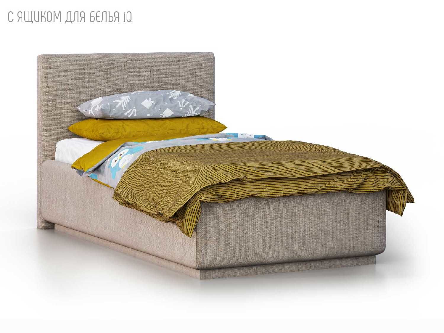 Кровать укомплектована IQ с подъемным механизмом и ящиком для белья без дна (дополнительная платная опция - дно к ящику IQ из HDF (ХДФ). Каркас кровати на цоколе, декоративный чехол на цоколе съёмный. Глубина ящика для белья - 30 см, без ограничения нагрузки на ящик.