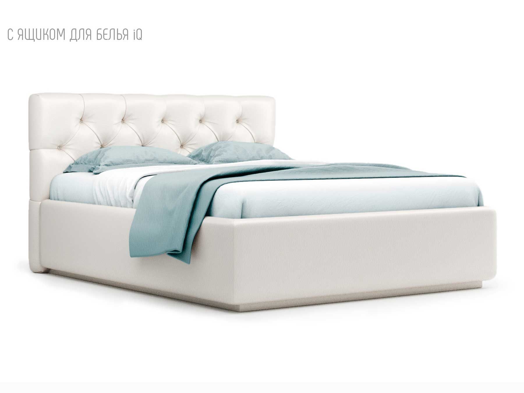 Кровать укомплектована IQ с подъемным механизмом и ящиком для белья без дна (дополнительная платная опция - дно к ящику IQ из HDF (ХДФ). Каркас кровати на цоколе, декоративный чехол на цоколе съёмный. Глубина ящика для белья - 30 см, без ограничения нагрузки на ящик.