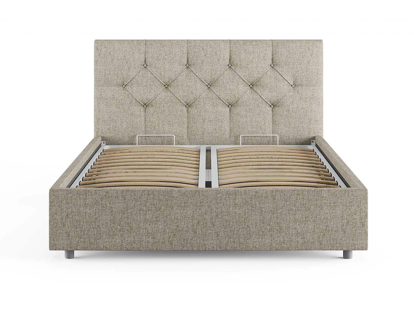 Кровать комплектуется металлическим основанием (без опор), которое имеет 13 рядов встроенных березовых ламелий на каждое спальное место, обеспечивая равномерное распределение нагрузки.