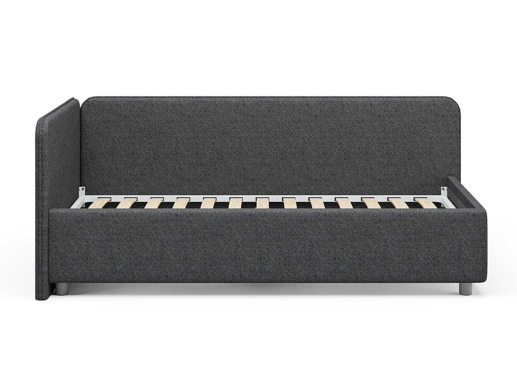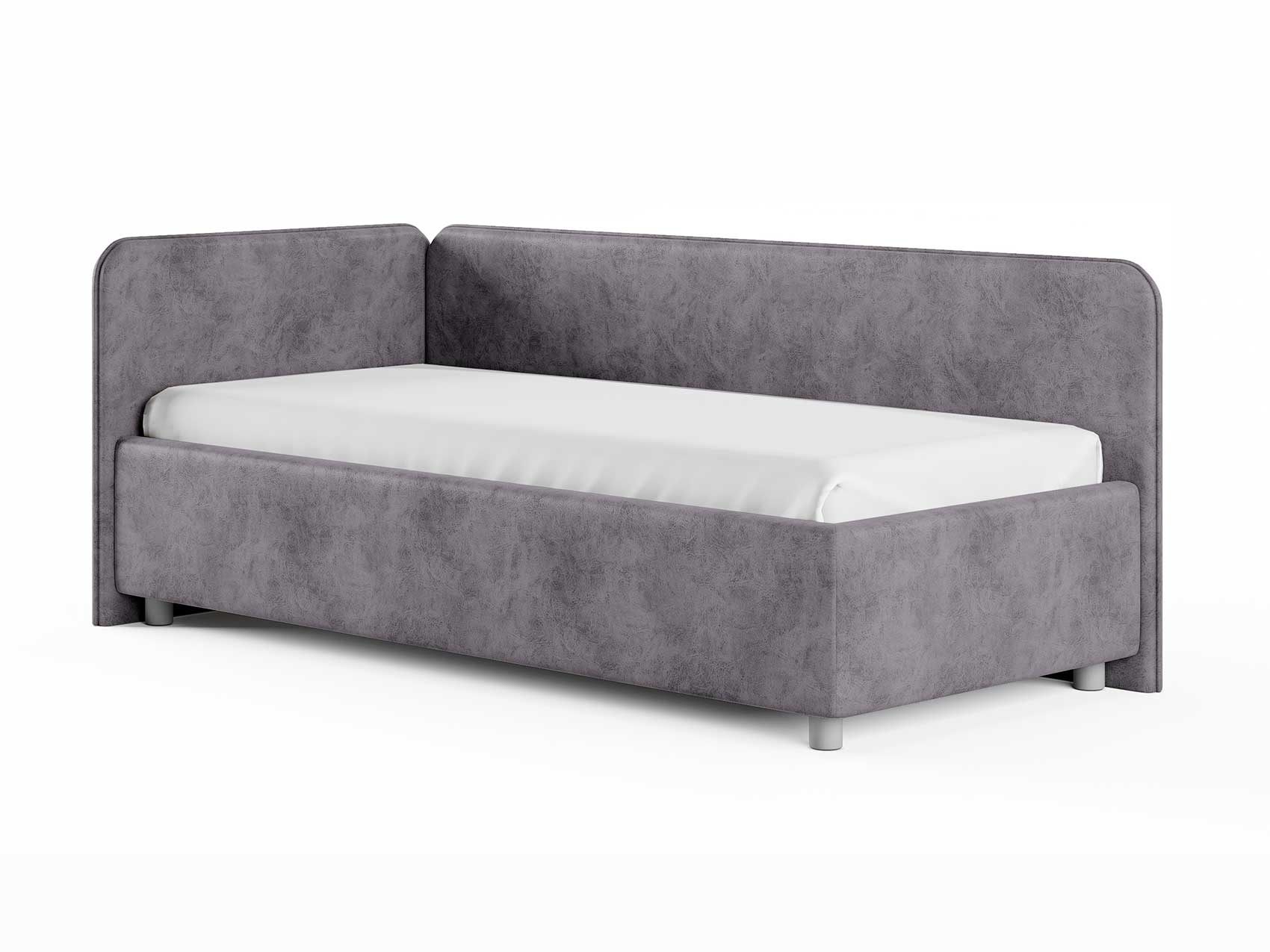Односпальная кровать в современном стиле. Кровать-софа с одной боковой спинкой. Идеально подходит для квартир с небольшой площадью, детских и подростковых спален, гостевых комнат. Боковую спинку кровати можно изготовить на выбор на правую или левую сторону. Модель изготовлена из ДСП. При необходимости, кровать можно укомплектовать подъемным механизмом с бельевым ящиком.