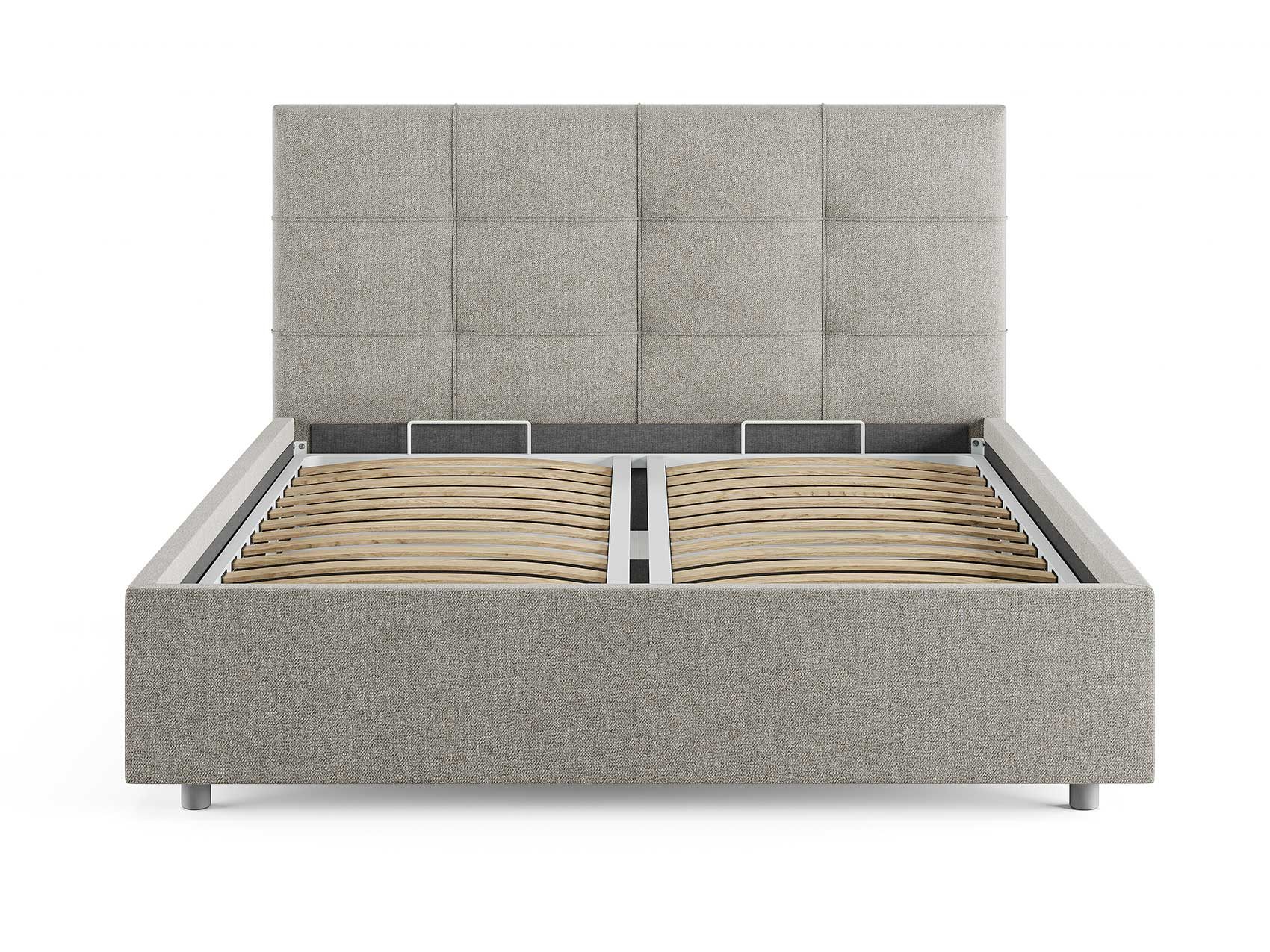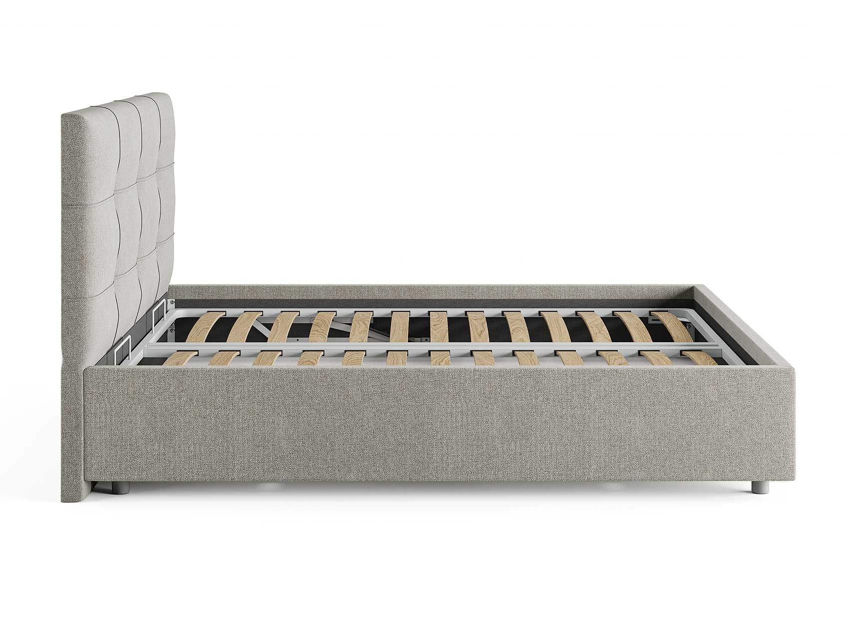 Кровать комплектуется металлическим основанием (без опор), которое имеет 13 рядов встроенных березовых ламелий на каждое спальное место, обеспечивая равномерное распределение нагрузки.