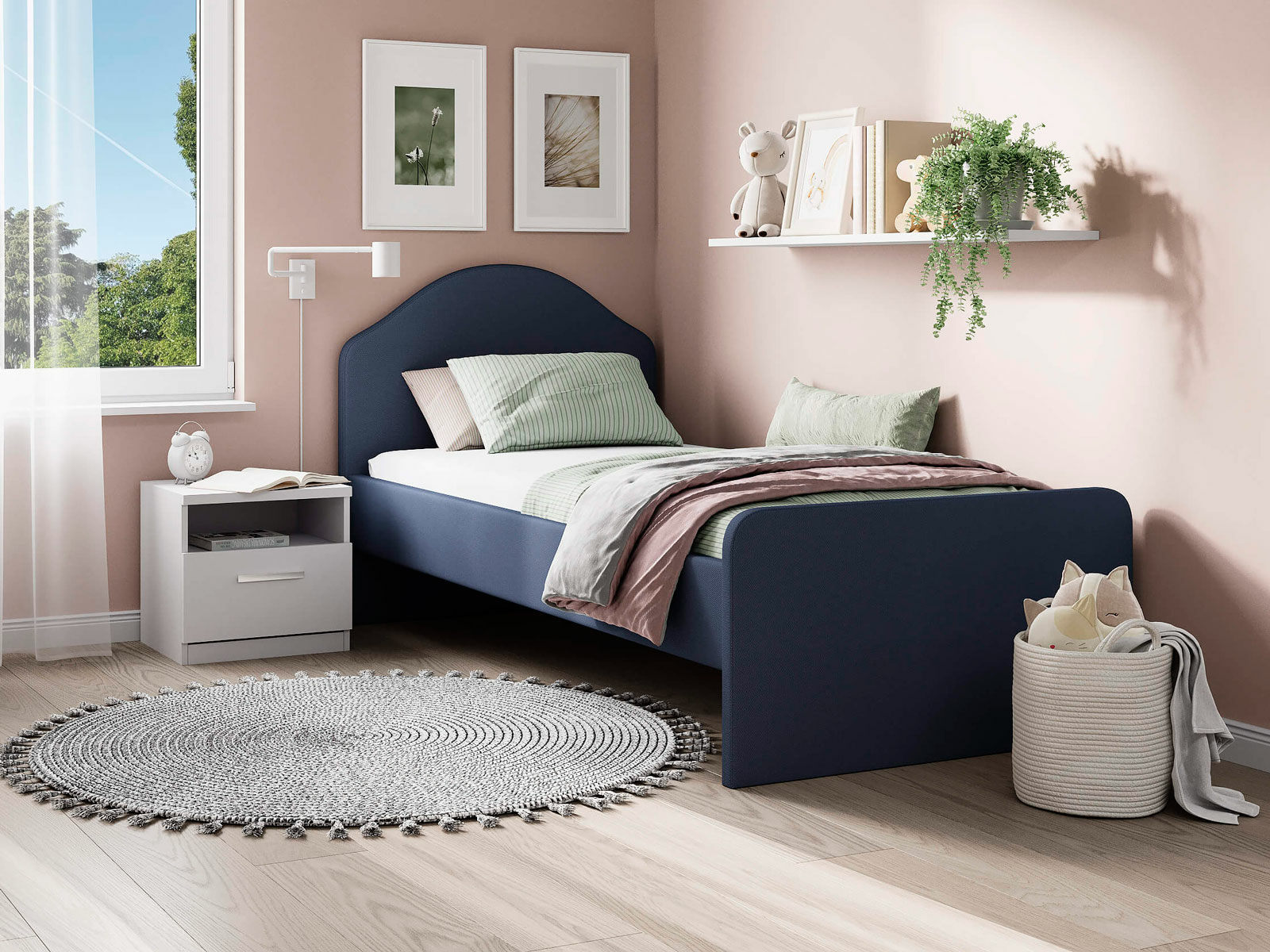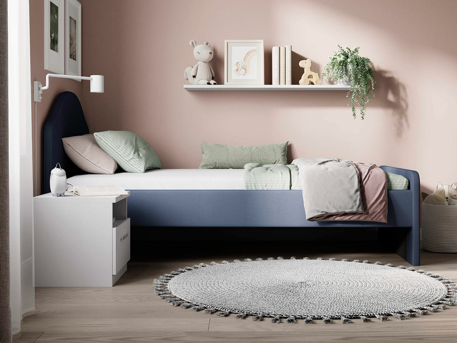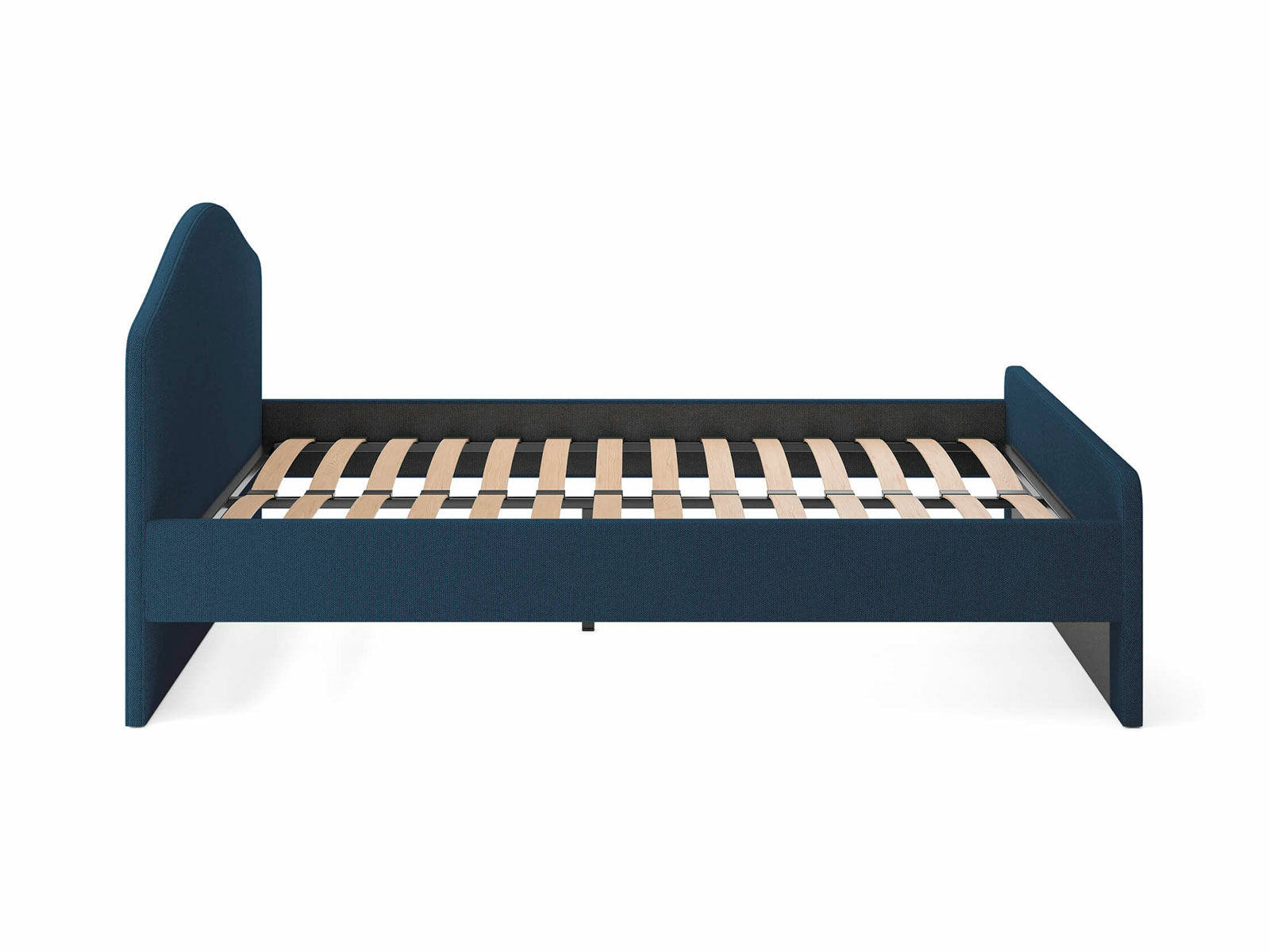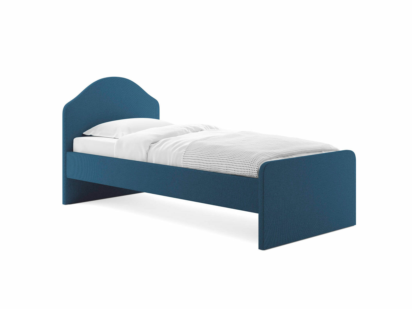 Мягкое изголовье с изгибом, плавные линии изножья, узкие царги делают кровать запоминающейся и уютной. Увеличенное расстояние до царг способствует легкой уборке под кроватью роботом – пылесосом, а также позволяет дополнительно приобрести выкатную тумбу или ящики для хранения вещей.