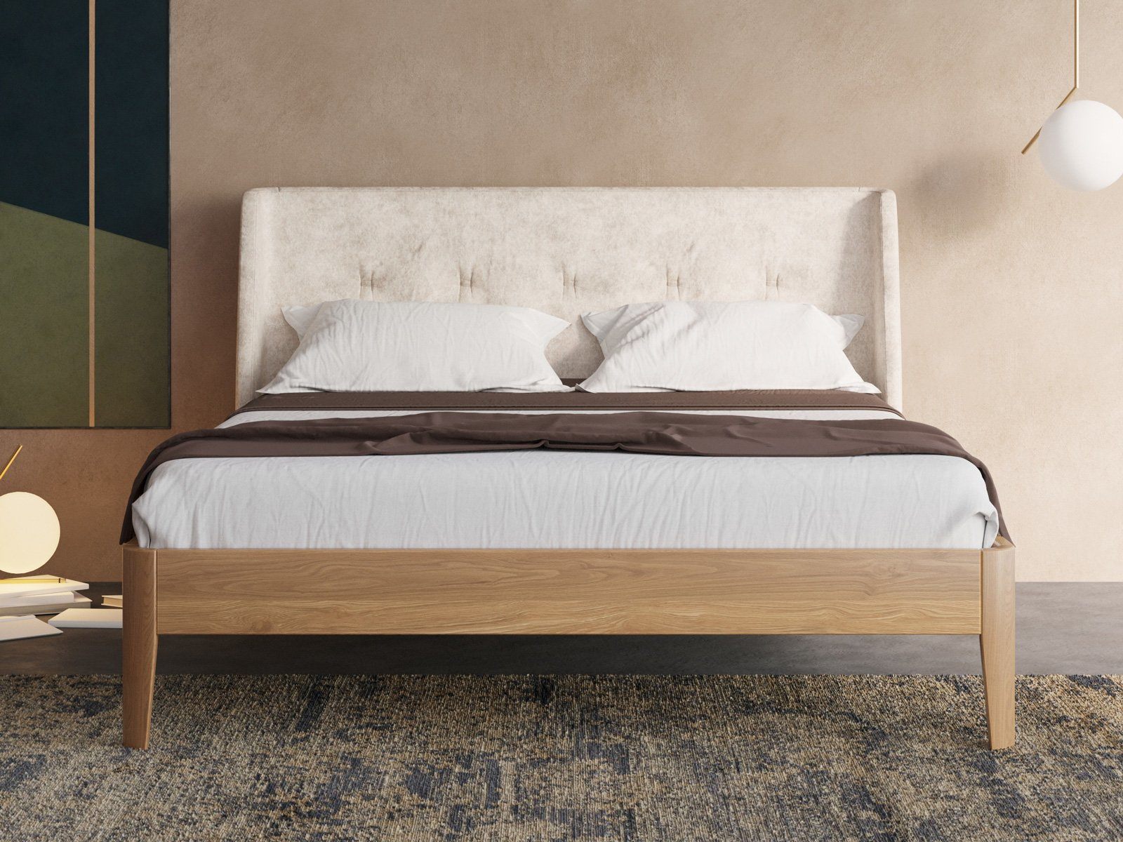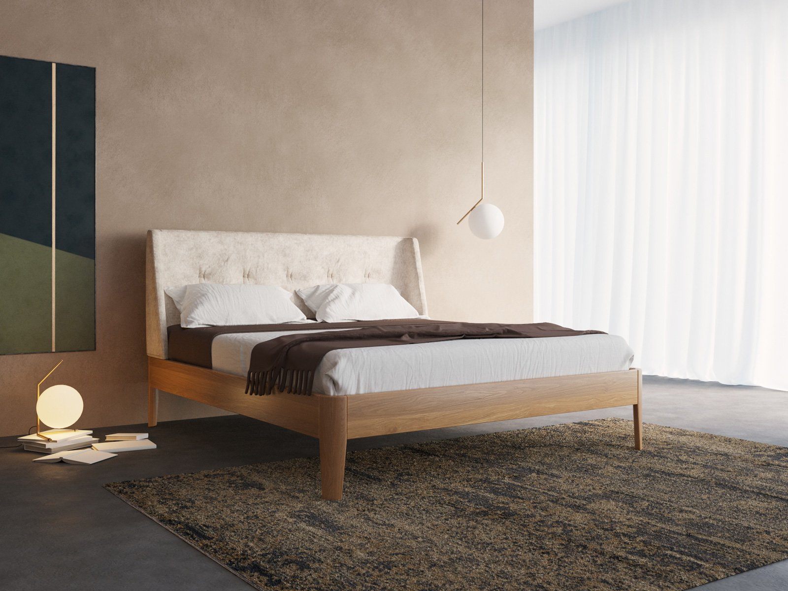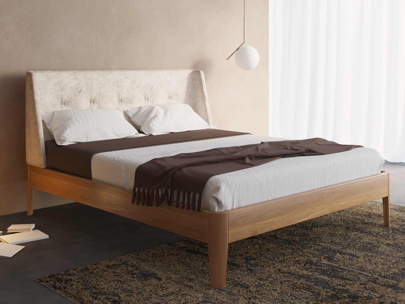 Выбрали кровать довольно быстро, так как заранее знали что хотели, но эта превзошла все наши ожидания, своим необычным тандемом дерева и замши.