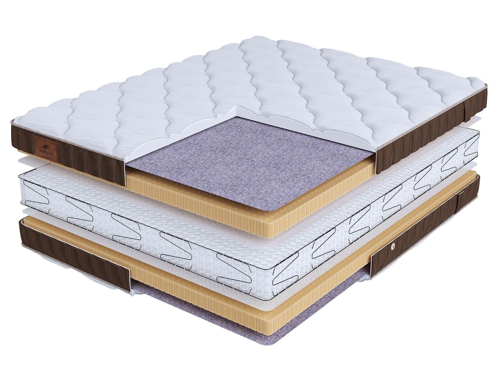 Хлопковая трикотажная ткань чехла обеспечивает комфорт и обладает отличной воздухопроницаемостью. Высокообъемная стежка с использованием холлофайбера (600гр.) подарит дополнительный комфорт спальному месту. Изысканный бурлет из мягкого велюра красивого бежевого цвета придает матрасу роскошный внешний вид и подчеркивает его премиальный статус. Каждая модель серии LIFE украшена фирменной кожаной биркой BeautySon, подтверждающая исключительность каждого матраса.