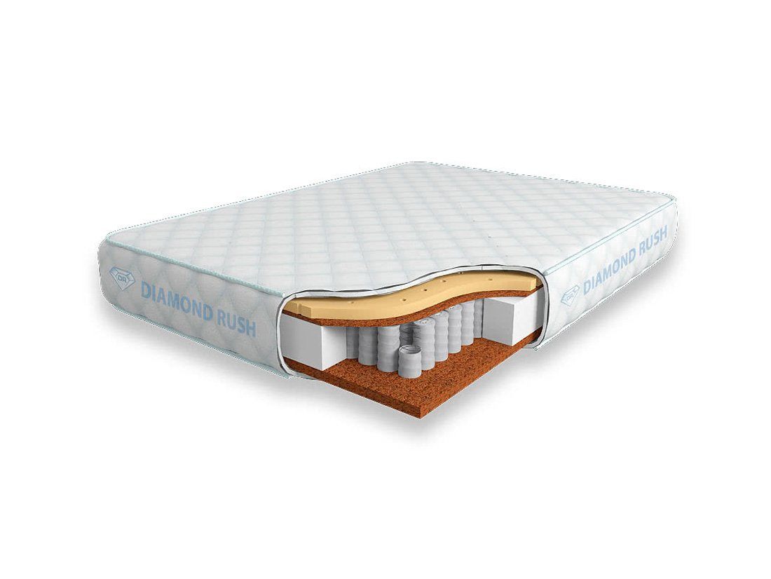 Матрас Diamond Rush Cocos Ergo 725DR имеет в своей основе независимый пружинный блок 725, состоящий из пружин диаметром 5-6 см. В качестве настилочных слоев поверх пружинного блока используются листы латексированной кокосовой койры и перфорированного натурального латекса. Матрас является жестким с одной стороны и среднежестким с другой.
