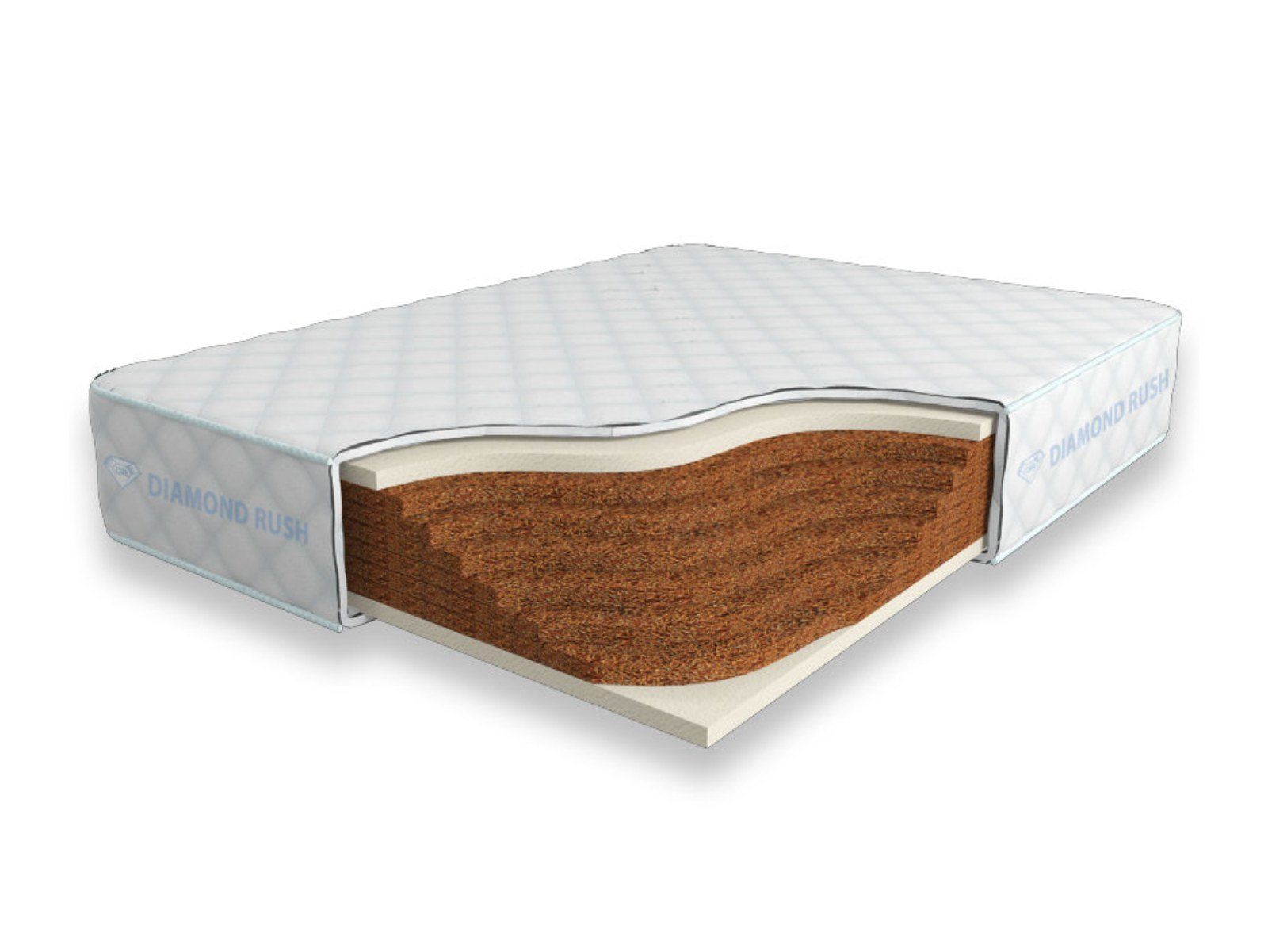 Матрас Diamond Rush Cocos Lite 24 SD не имеет в своей основе пружинного блока. В основе модели идут кокосовые плиты, их количество зависит от требуемой высоты матраса. Сверху и снизу для большего комфорта и придания средней жесткости прокладываются листы по 3см искусственного латекса. Эта модель имеет идентичные по жесткости стороны.