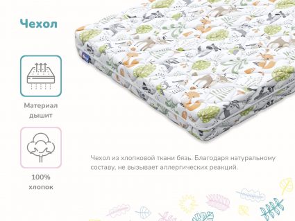 На матрас шьётся съёмный чехол. Тканью изделия выступает хлопковая бязь с ярким детским принтом.