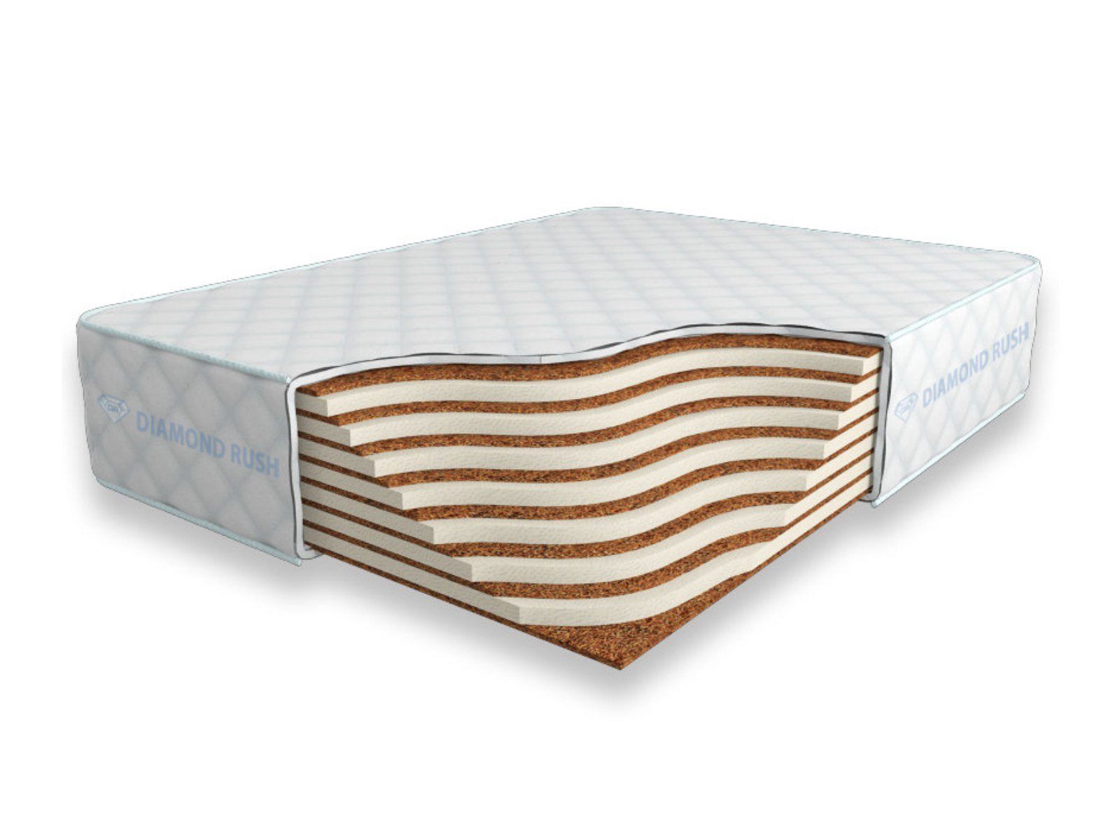 Матрас Diamond Rush Mono Mix Cocos 29 SD является беспружинным, т.е. не имеет в своей основе пружинного блока. В его состав входят несколько чередований слоев латексированной кокосовой койры (1см) и искусственного латекса (3см). Такая модель матраса относится к среднежестким и обладает средним ортопедическим эффектом.