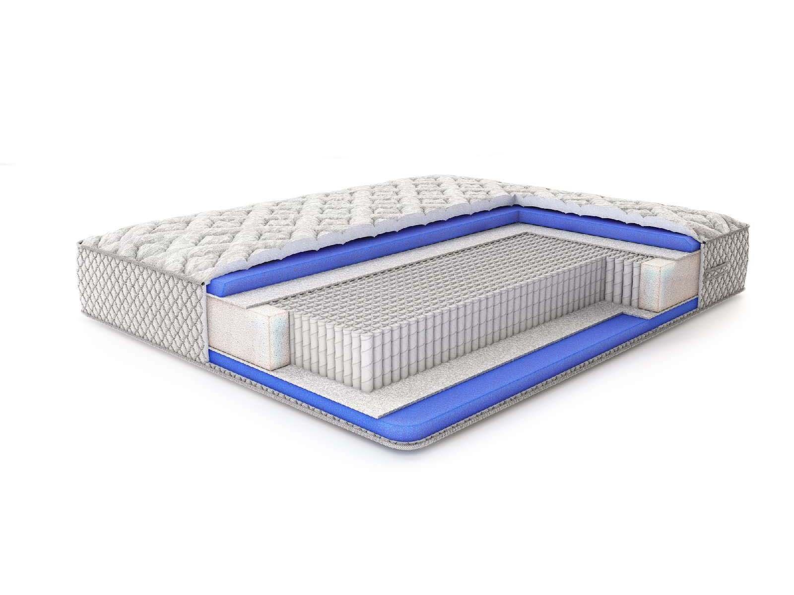 Для обивки матраса реализован жаккард с тремя слоями для стёжки: холлкон 300 гр., ППУ 1 см и спанбонд. Прострочка методом джампинга позволяет добиться более выраженного и красивого рельефа сторон. Бурлет оформляется при помощи практичного серого жаккарда.