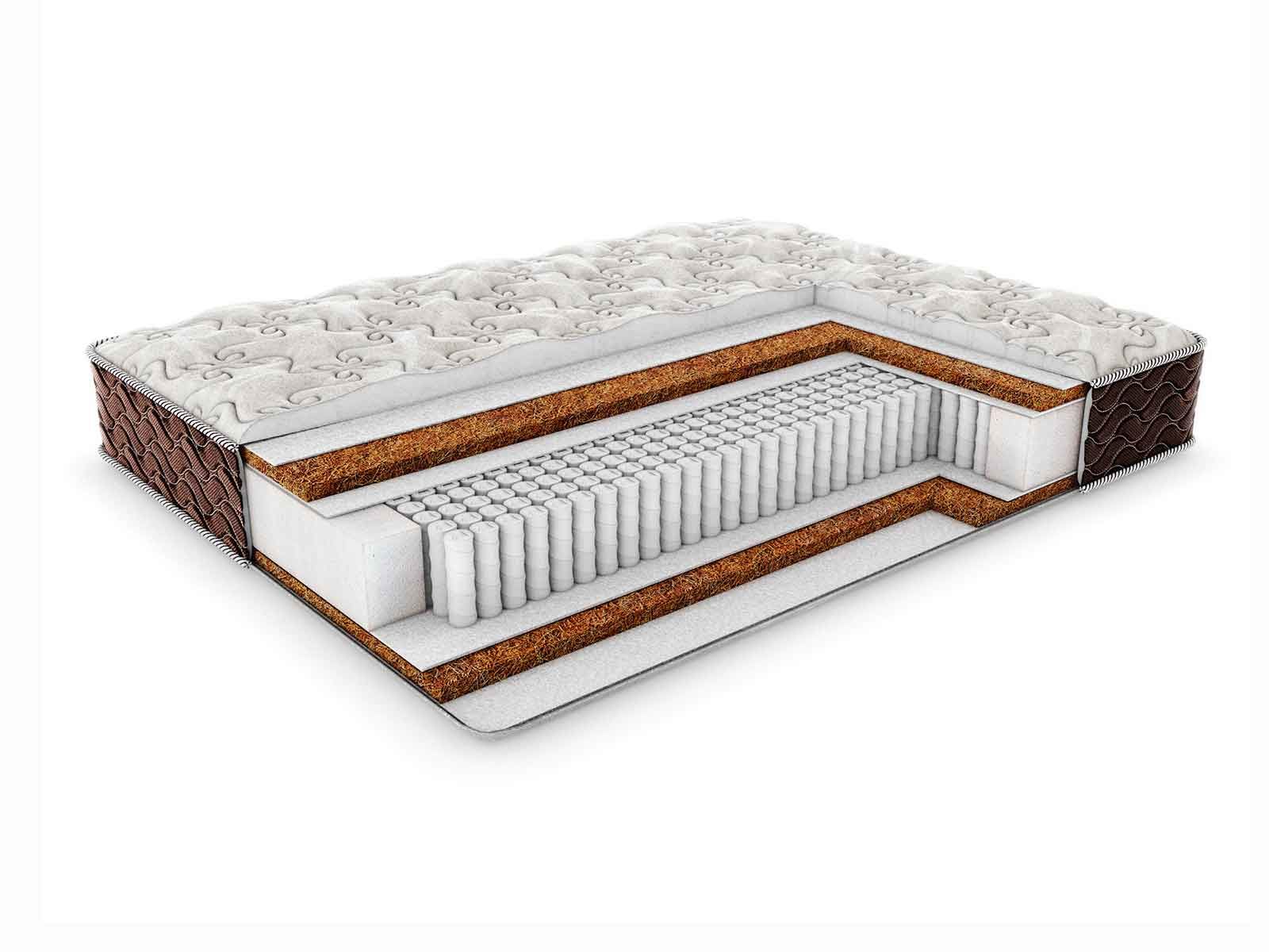 У каждой из поверхностей спальной принадлежности расположился 3 см слой койры кокоса. Данный наполнитель является одним из самым популярных жёстких материалов, поскольку обладает высокой прочностью. Однако более всего он ценим за ортопедические возможности, которые он щедро передаёт спальному месту.