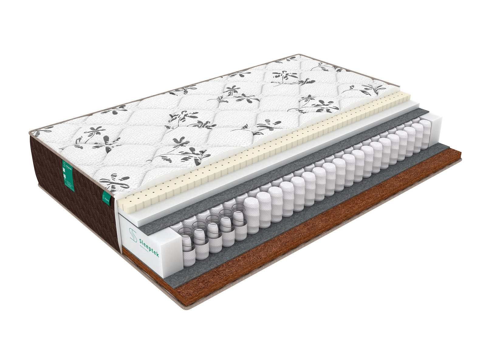Двусторонняя модель Duplex LatexNorma Cocos с различной жесткостью сторон – жесткая и умеренно-мягкая. Основа матраса независимый пружинный блок Double Spring. Данный блок отличается от стандартных более высокой плотностью пружинок на квадратный метр, что достигается встраиванием в основную пружину еще одной, меньшего диаметра. Такая конструкция делает блок более прочным и значительно повышает его несущую способность. Работа пружин напрямую зависит от степени оказываемого на матрас давления. При небольшой нагрузке работают только основные пружины, чем выше становится нагрузка – тем больше внутренних пружин включается в работу. В итоге спящему обеспечивается оптимальная поддержка, точно отвечающая особенностям его сложения (весу и формам тела).Блок пружин отделен от наполнителей слоями термовойлока,он защищает наполнители от контакта с пружинами и продлевает срок службы матраса.