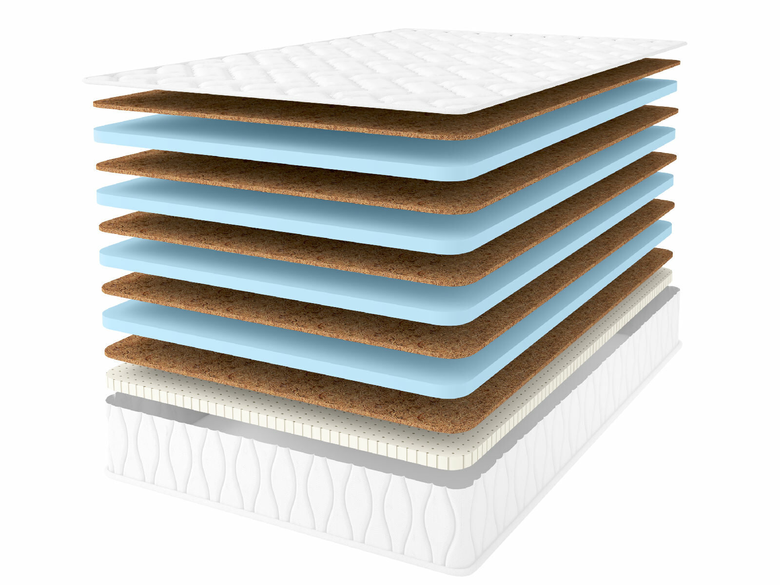 Сразу у поверхностей расположились кокосовая койра с одной стороны и натуральный перфорированный латекс с другой. Такая структура даёт матрасу различную твёрдость – среднюю и умеренно-жёсткую.