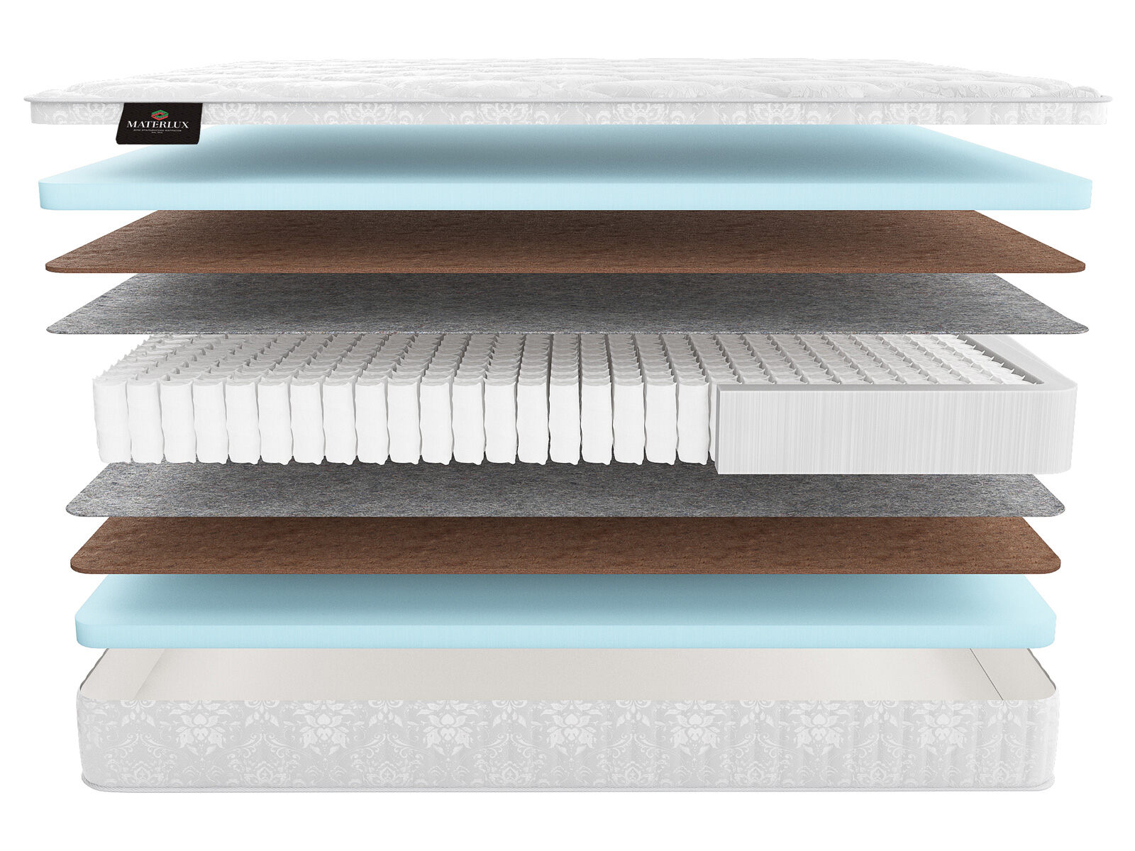Латексированный кокос (1 и 3 см; пл 85): обеспечивает стойкость и долговечность матраса, этот материал предотвращает его проваливание и изменение формы. Кроме того, он обладает превосходными ортопедическими* характеристиками, поддерживая правильное положение позвоночника.