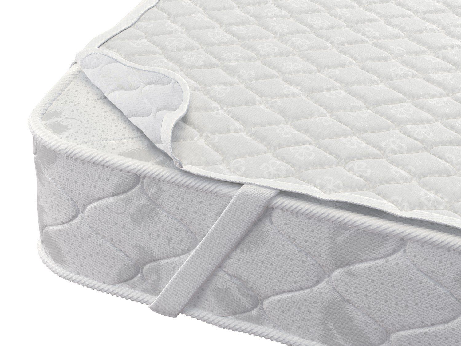 На изделии предусмотрены четыре угловые резинки для плотной фиксации к спальной поверхности. Толщина наматрасника составляет 1 см.