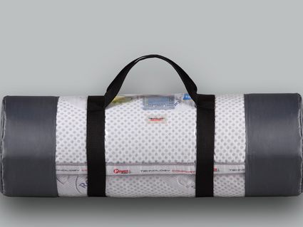 Наматрасник скручен в рулон диаметром 30 см, упакован в плотную прозрачную полиэтиленовую пленку, имеет защитные колпачки серого цвета по краям, две удобные ручки для транспортировки изделия.