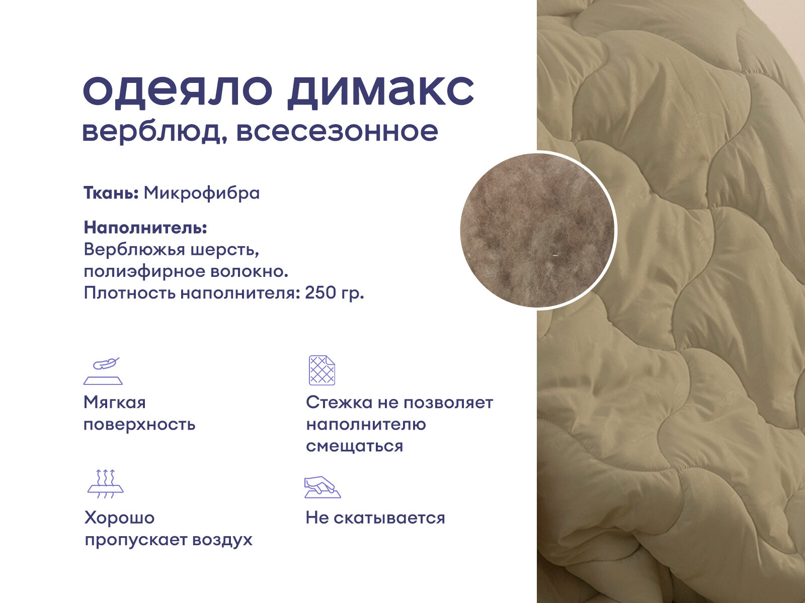 Лучший спутник для комфортного сна в любое время года! Это настоящая находка для тех, кто ценит качество, комфорт и здоровый сон. Секрет одеяла – в натуральном наполнителе из верблюжьей шерсти, который обеспечивает совершенную терморегуляцию. Терапевтические свойства шерсти улучшают кровообращение, снимают напряжение и подарят вам уютный и спокойный сон. Забудьте о ночах, когда вам жарко или холодно – это одеяло создаст идеальный микроклимат для сна в любое время года.