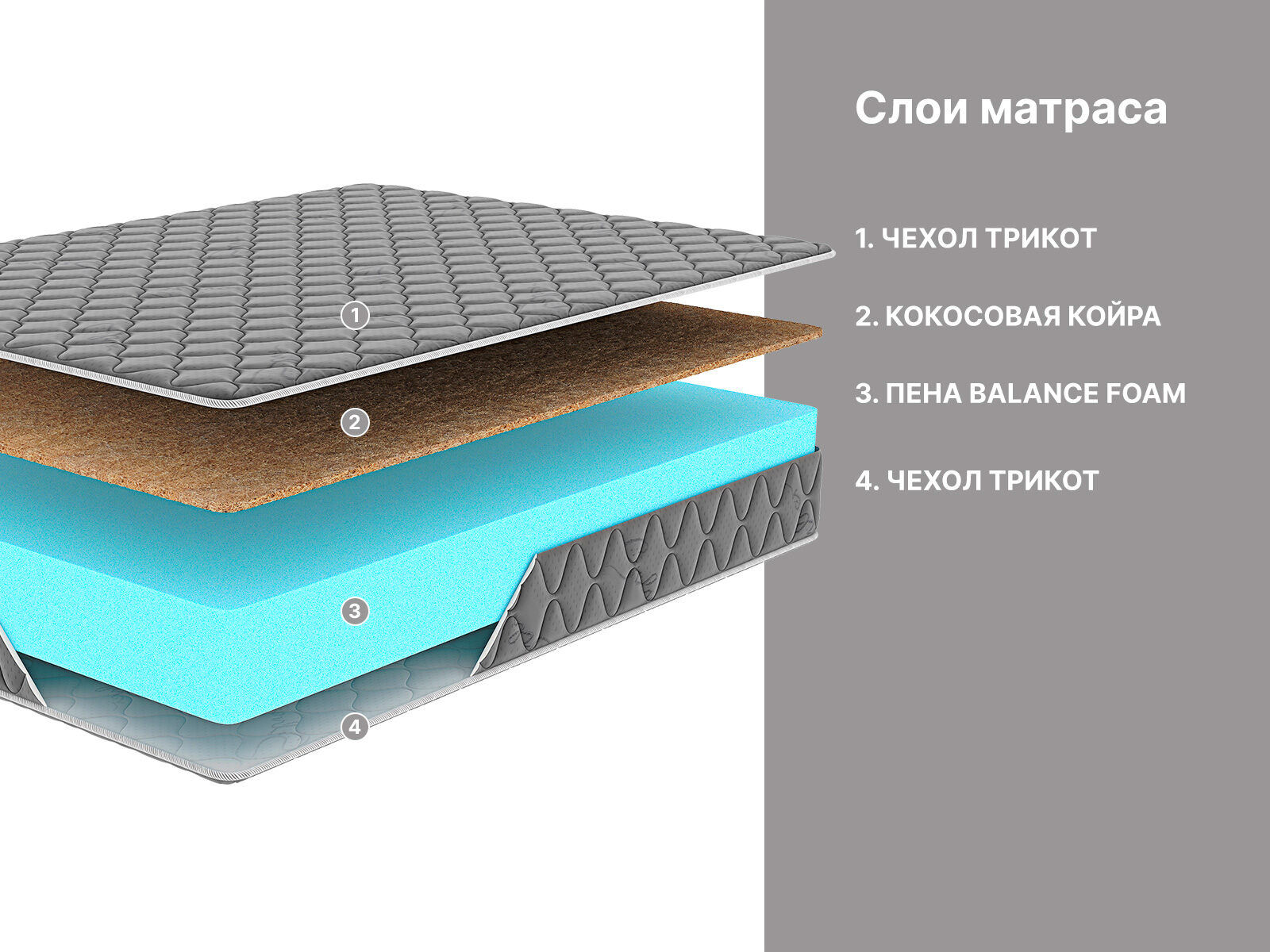Натуральная койра кокоса добавляет жёсткости и наделяет спальную поверхность более яркими ортопедическими качествами – она дублирует S-образный изгиб позвоночника, сохраняя его естественное положении на протяжении всей ночи.