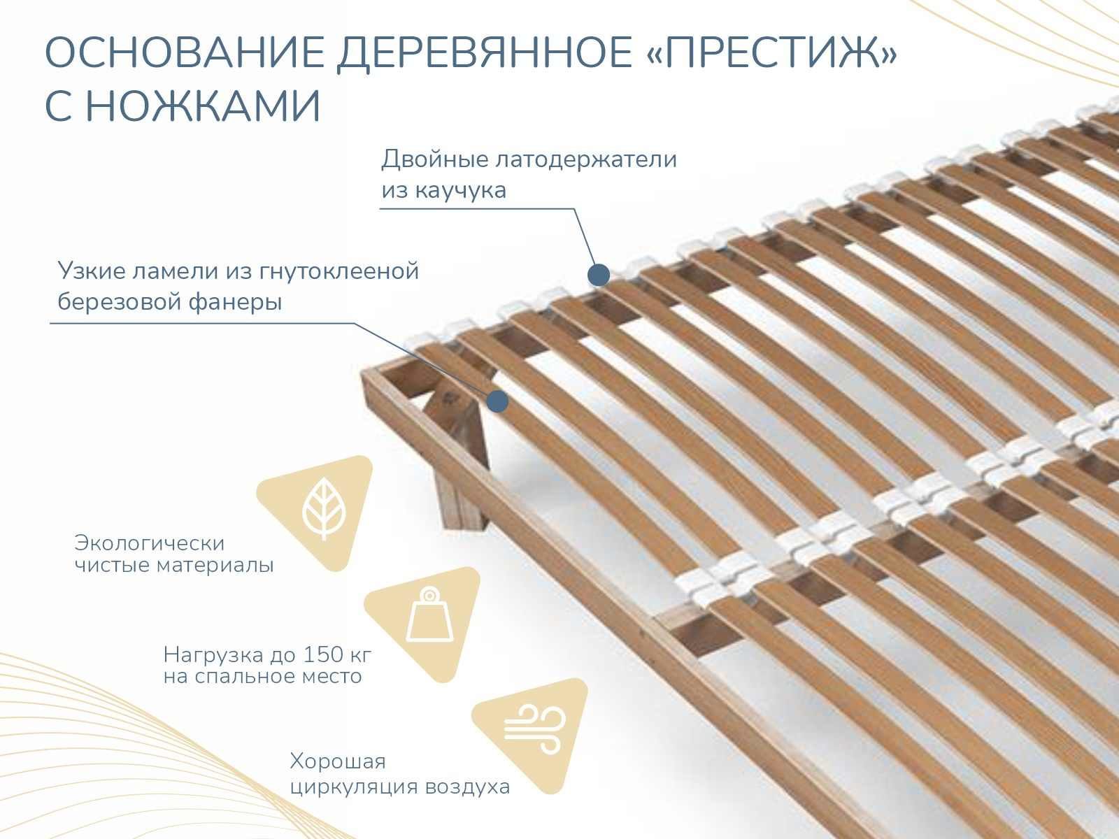 Основание для матраса - клееная фанера из березы сечением 50х25мм. Идеально подходит для матрасов на независимом пружинном блоке, так как благодаря небольшому(около 3 см) расстоянию между латофлексами, не допускается проседание пружин в блоке. Высота ножек может быть любой по желанию клиента.