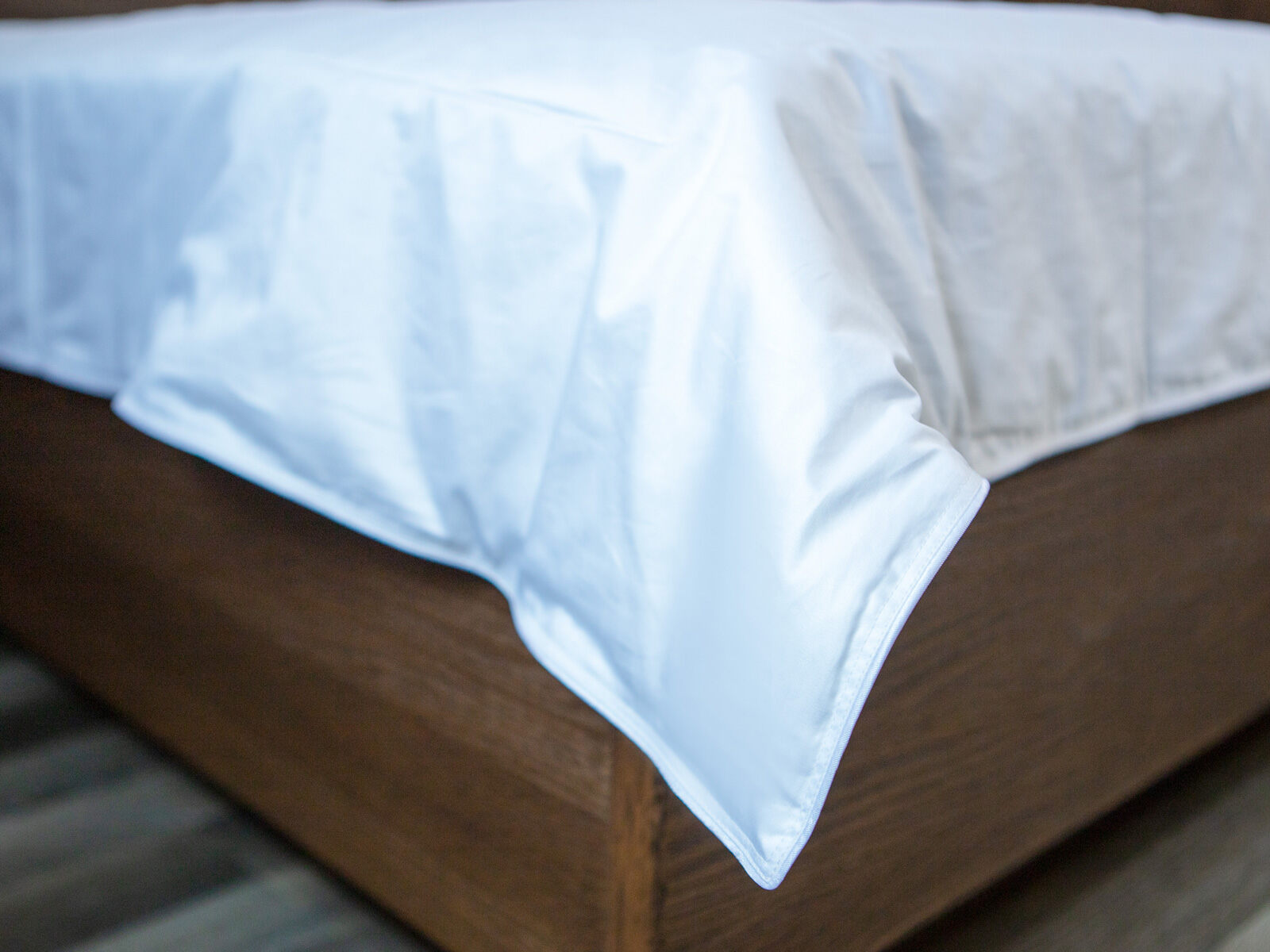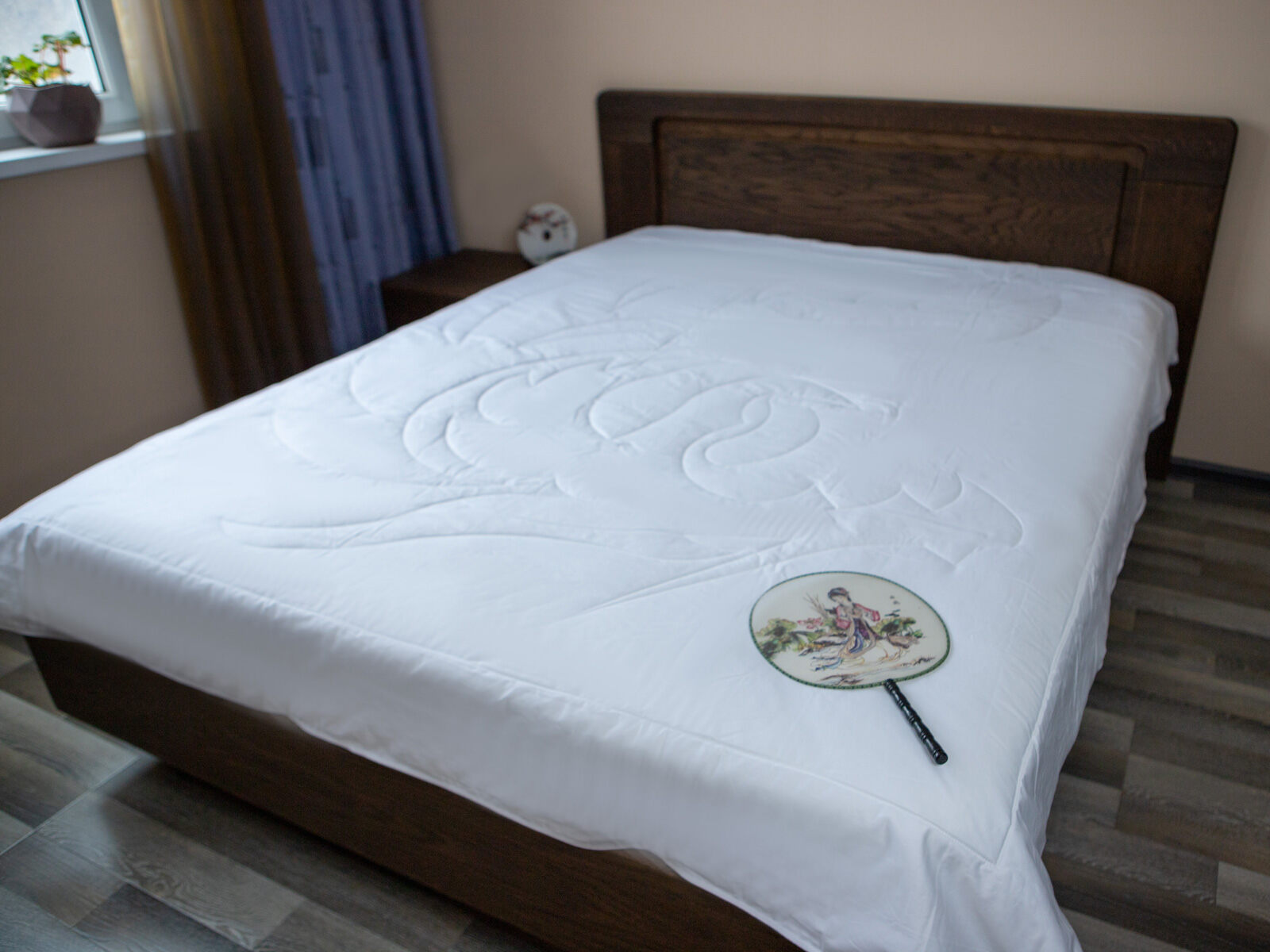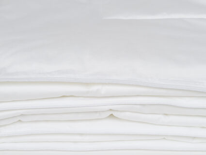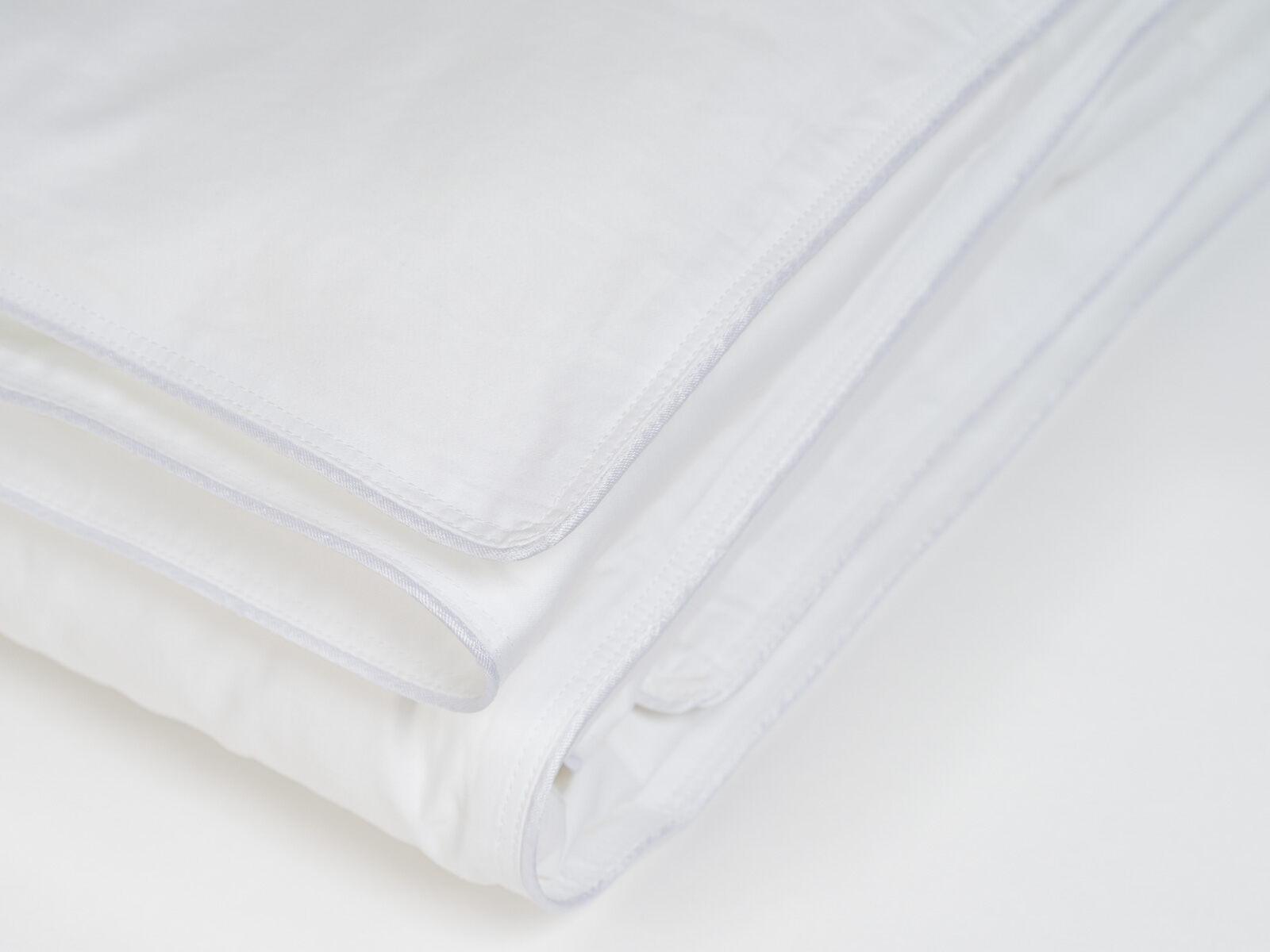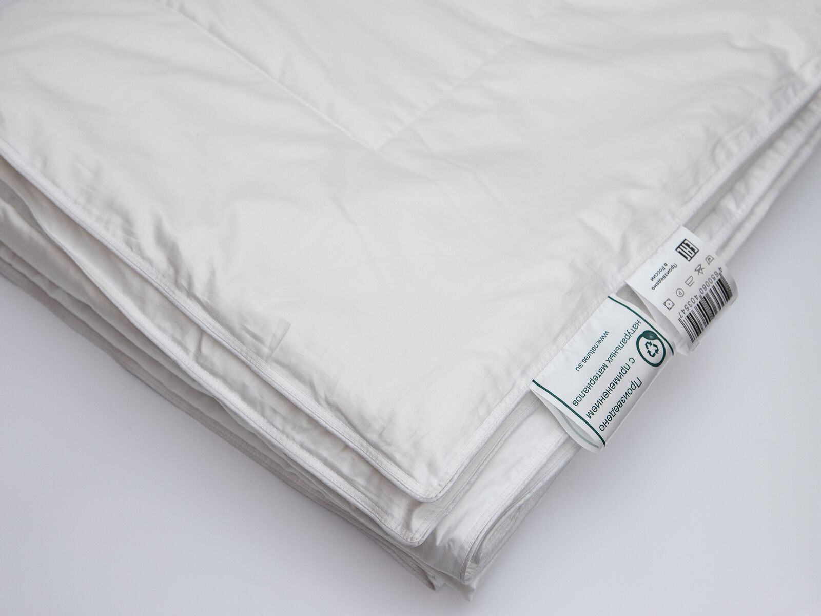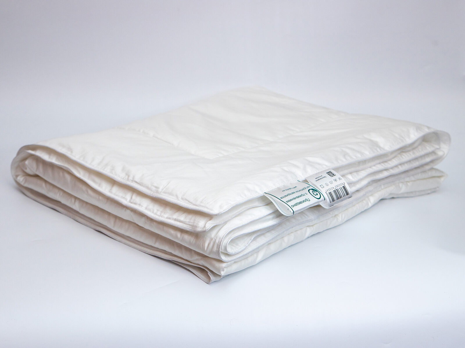 Ткань: 100% хлопок — гребенной сатин (AIR JET) из длинноволокнистого хлопка, обеспечивающего отсутствие ворсистости, тонкую и ровную ткань. Плотность: 268/186 нитей на 10 см²,135 г/м². Цвет белый. Стежка на одноигольной машине по оригинальному рисунку, по периметру одеяла атласный кант и двойная отделочная строчка, которая исключает миграцию наполнителя через швы.