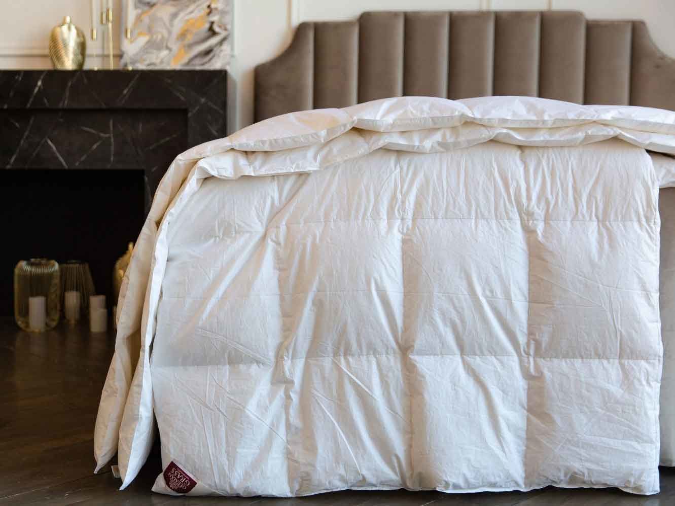Наполнитель: 100% новый, гусиный белый пух высшего качества, отсортированный вручную, с коэффициентом упругости (Fill Power) не менее 800ед.