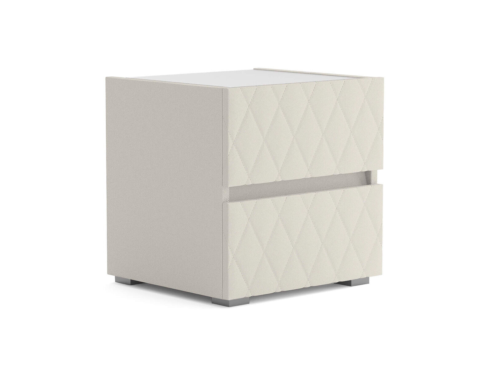 Тумба с мягкими фасадами, украшенными изысканной стежкой в виде ромбов, представляет собой идеальное сочетание утонченного дизайна и функциональности. Два выдвижных ящика с направляющими скрытого монтажа оснащены доводчиками. Тумбу дополнительно можно укомплектовать стеклянной столешницей. Широкий выбор фактур и цветов исполнения.