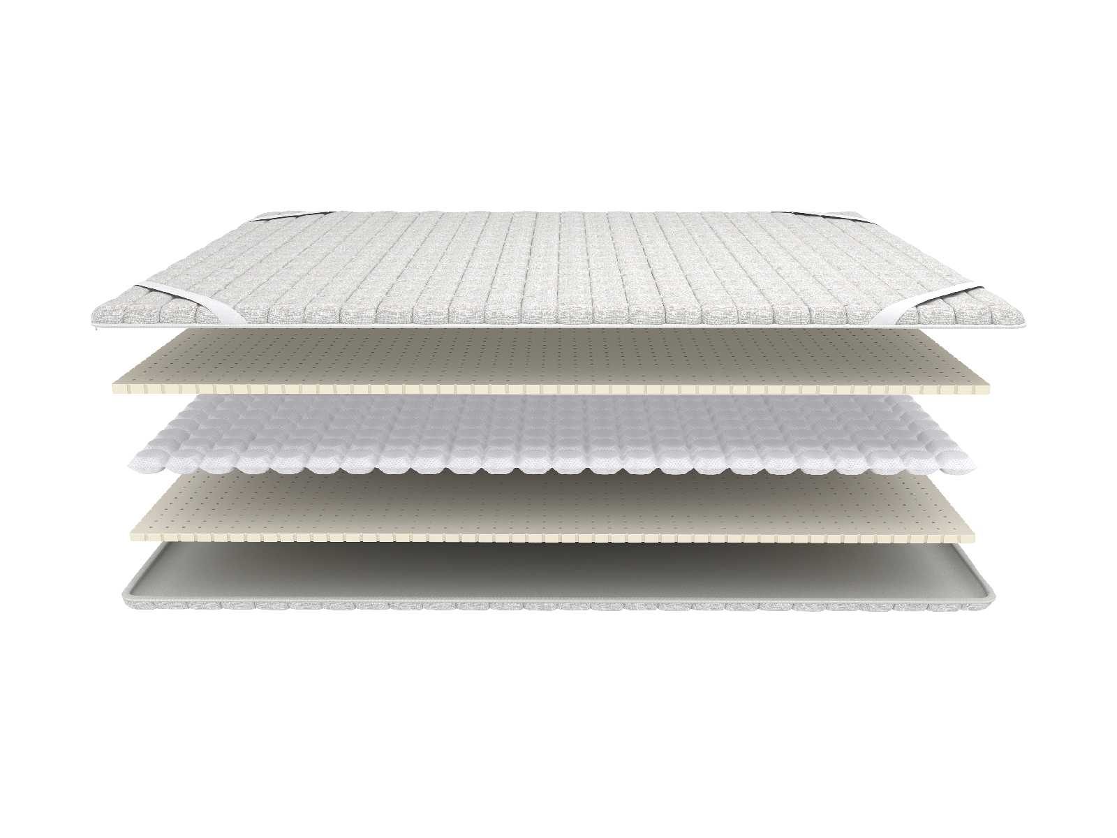 Две плиты натурального латекса разделяет блок нанопружин. Механизм отвечает за правильную точечную подстройку спальной принадлежности под фигуру и изгибы силуэта.