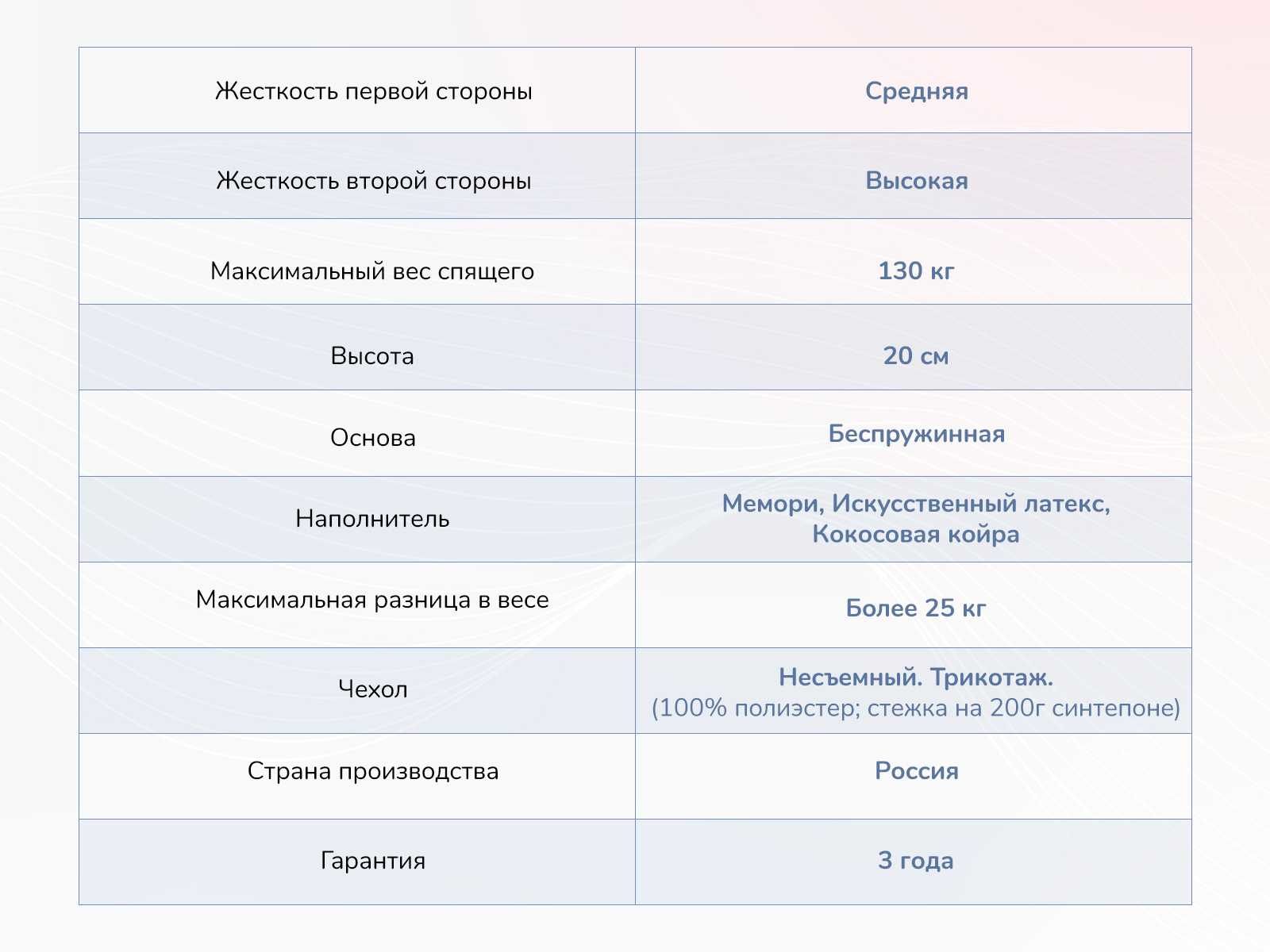 Матрас оценят как любители жёстких поверхностей, так и поклонники мягкого «объятия» пены Мемори, при этом наслаждаясь бесшумностью и простотой эксплуатации.